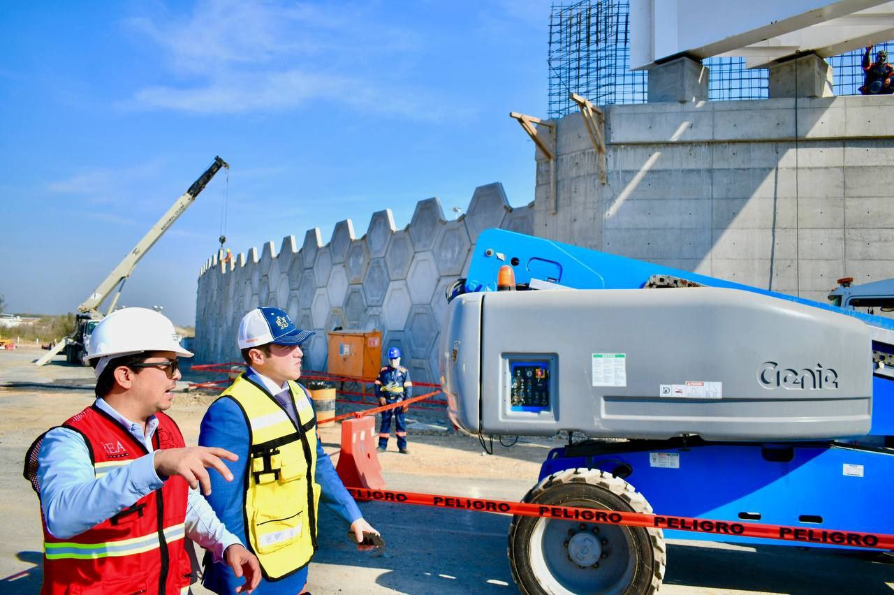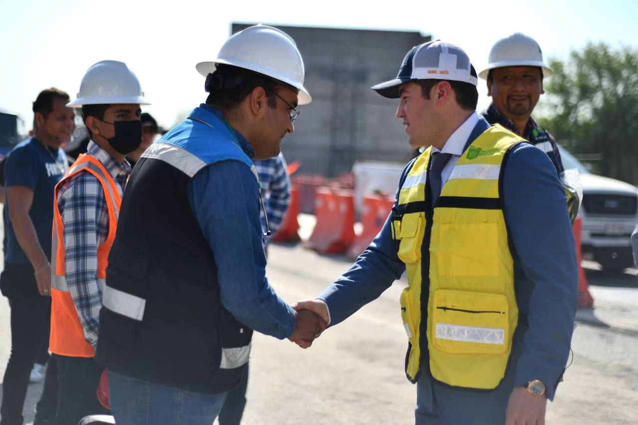 Montemorelos, Nuevo León.- El Gobernador Samuel Alejandro García Sepúlveda supervisó este martes la colocación de los trabes en el entronque que conectará el Periférico del Área Metropolitana de Monterrey con la Carretera Nacional.