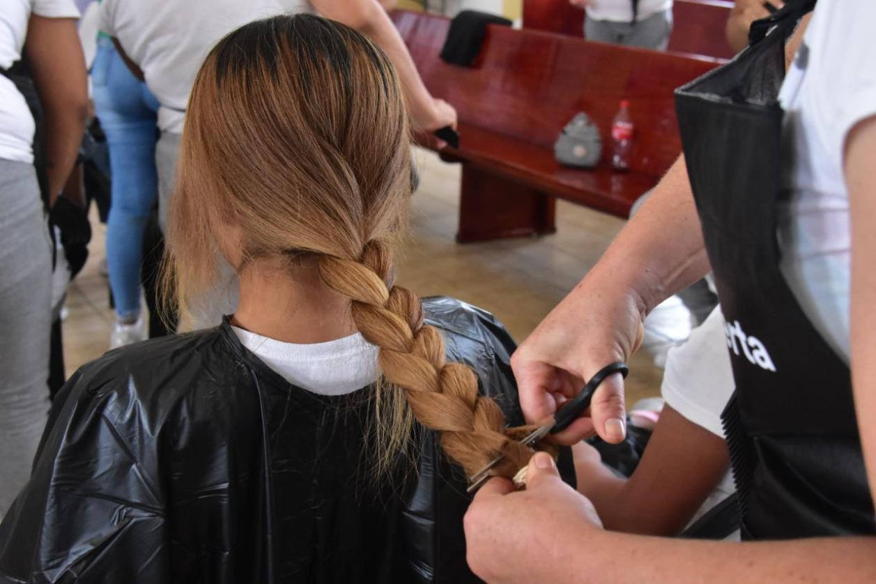 Como parte de las actividades de reinserción social y prácticas restaurativas, mujeres privadas de la libertad del Centro de Reinserción Social Femenil, que participan en la escuela de Estilismo e Imagen impartido por la asociación Reinserta.org, cortaron el cabello en forma de trenza a 48 donantes.