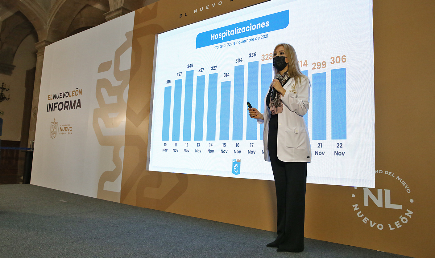 Marroquín Escamilla informó que Nuevo León se mantiene en una meseta en el número de contagios, con 146 nuevos casos, 6 defunciones y 306 hospitalizaciones hasta el 22 de noviembre, lo que refleja una estabilidad en los indicadores que determinan el Semáforo Epidemiológico; con 5 indicadores en color verde, 4 en amarillo y 1 en naranja.