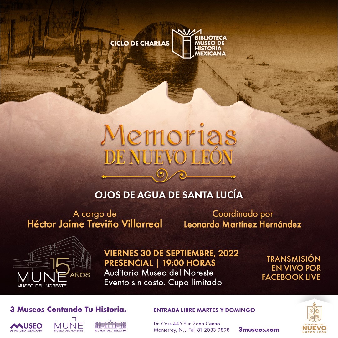 Lucía, el río y ojos de agua: Tiempo y Espacio, la charla a cargo del historiador Héctor Jaime Treviño Villarreal que aborda la importancia de este manto acuífero, en el escenario geográfico donde se desarrolló la fundación primigenia de la Ciudad de Nuestra Señora de Monterrey, se realizará el viernes 30 de septiembre a las 19:00 horas en el Auditorio del Museo del Noreste, dentro del ciclo Memorias de Nuevo León.