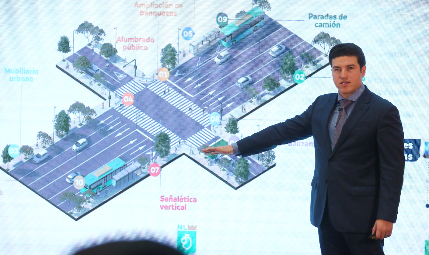 Este es el piso que queremos dejar en seis años, banquetas, arbolado, paradas de camión, alumbrado, iluminación peatonal para amigos que estén en sillas de ruedas, señalética, ciclovías, eso es lo que se va a empezar a ver a partir del año que entra en las principales avenidas de Nuevo León”, explicó el Mandatario estatal.