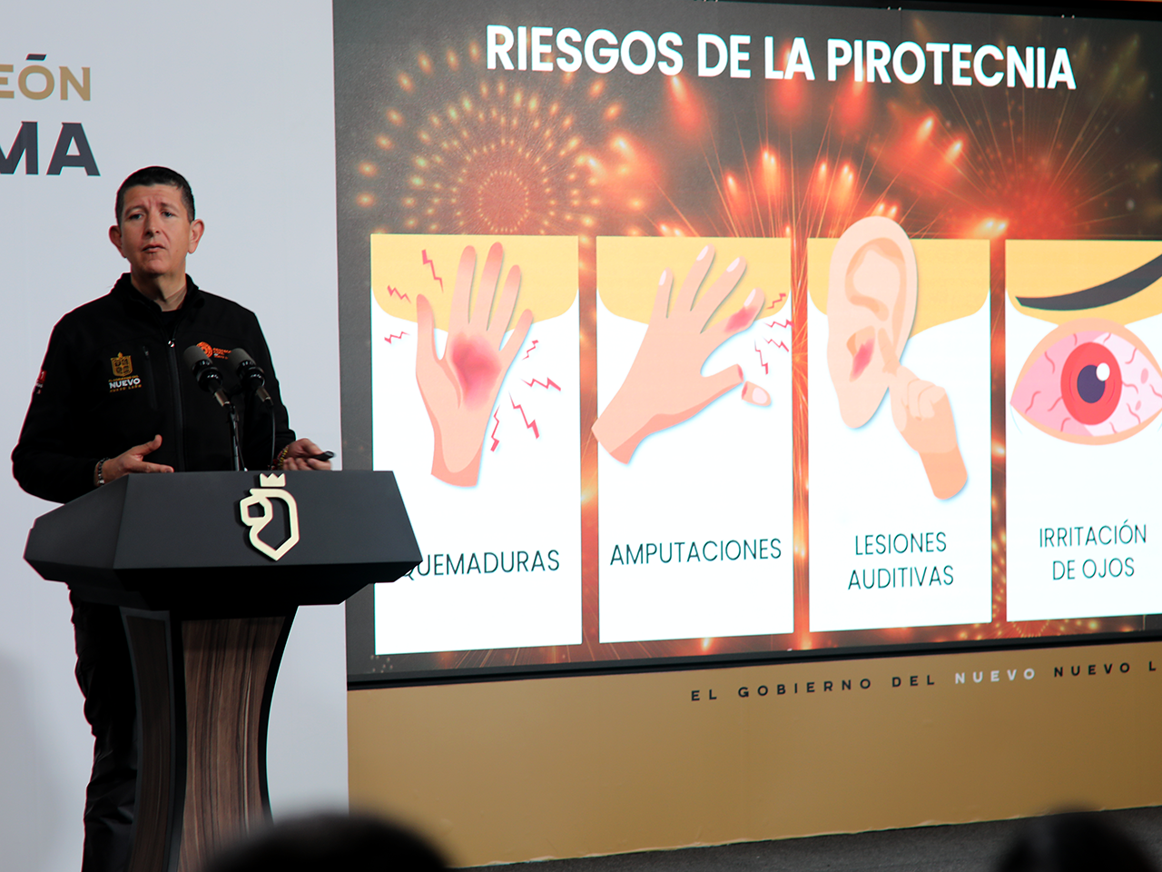 “En estas fechas decembrinas que debe ser amor paz tranquilidad salud, aumenta más de un 35% los incidentes y lesiones a causa de la pirotecnia, sin hablar en el caso de los incendios en vehículos, terrenos baldíos, casas habitación entre otros a causa de la misma pirotecnia, la pirotecnia no es un juego. No queremos que se use la pirotecnia para evitar este tipo de lesiones que nos van a marcar toda la vida una amputación, una quemadura o inclusive perder la vista o perder la vida”, apuntó el Director de Protección Civil de Nuevo León.