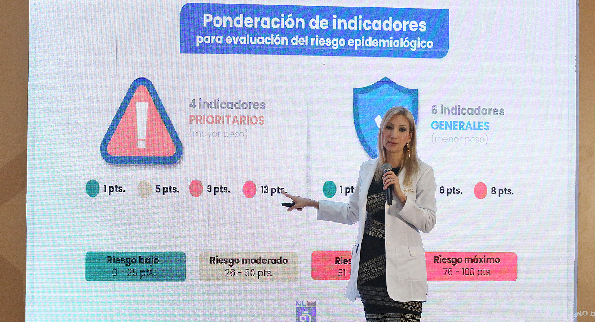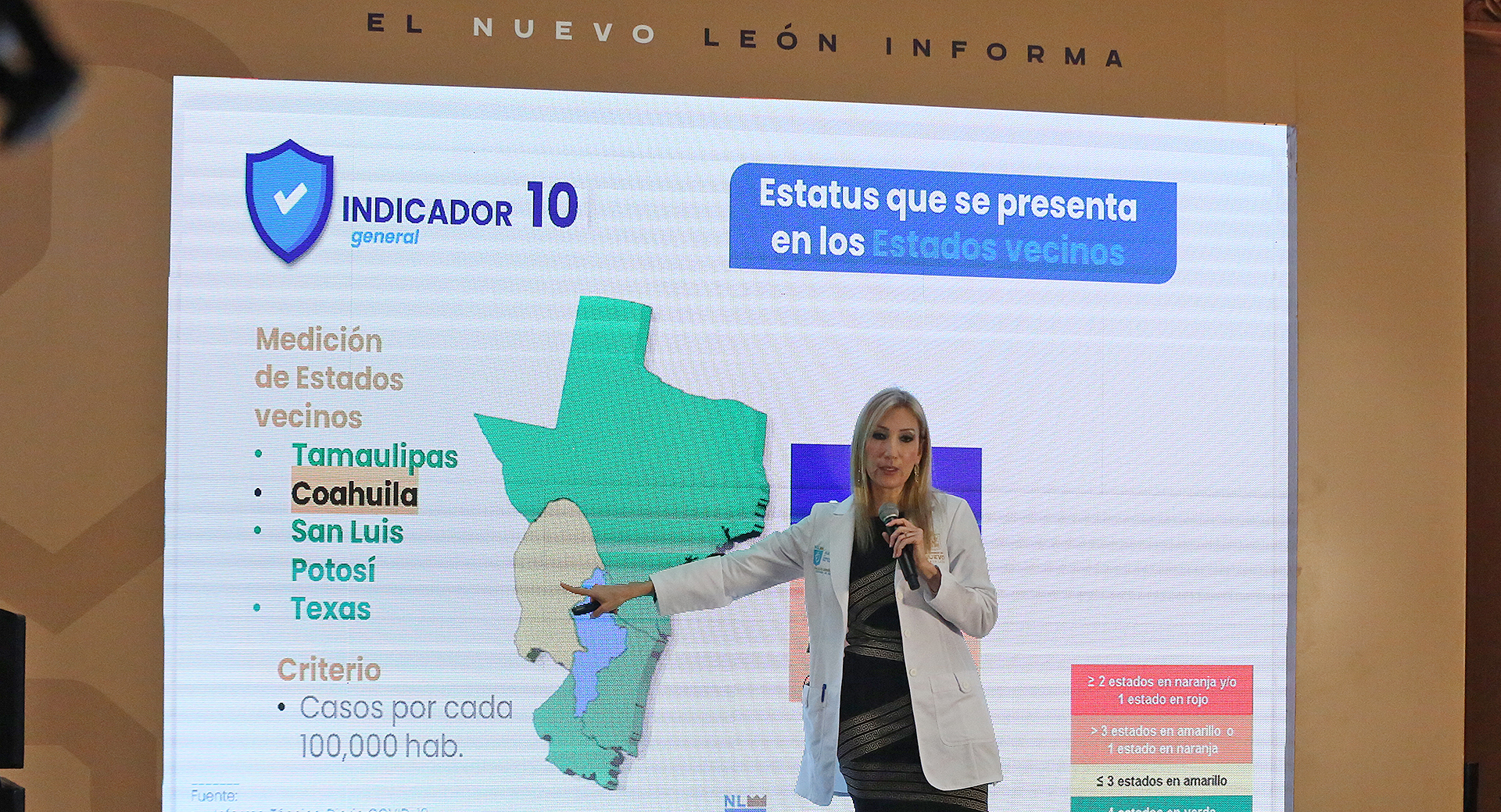 "Dentro de los 10 indicadores que teníamos eliminamos la capacidad instalada de pruebas diarias y la comparación contra las enfermedades respiratorias, dejamos el dato que más nos interesa, que es la comparativa de neumonías, y agregamos dos indicadores nuevos, que son la cobertura de vacunación completa, incluyendo segundas dosis, y el estatus que se presenta en los estados vecinos, incluyendo Texas".