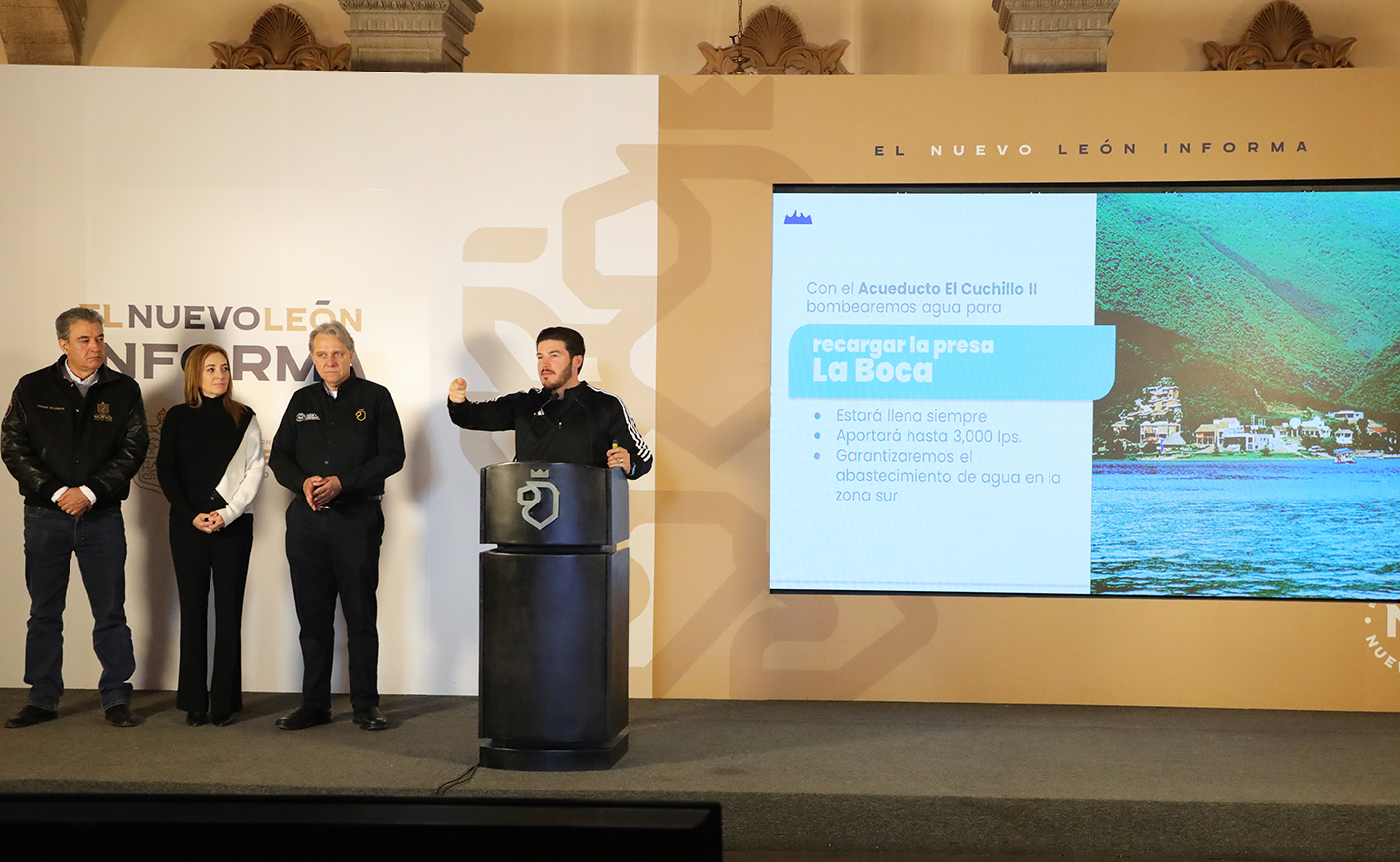En el Nuevo León Informa, García Sepúlveda destacó los nuevos proyectos como el tratamiento avanzado de tecnología para agua potable vía terciaria el cual se prevé aporte 2,400 litros por segundo a la ciudad, y que se licitará en fases para la conducción de agua de la presa El Cuchillo a La Boca; otro es la segunda Presa Rompepicos que además de prevenir riesgo de inundaciones, evitaría desastres en época de lluvia.