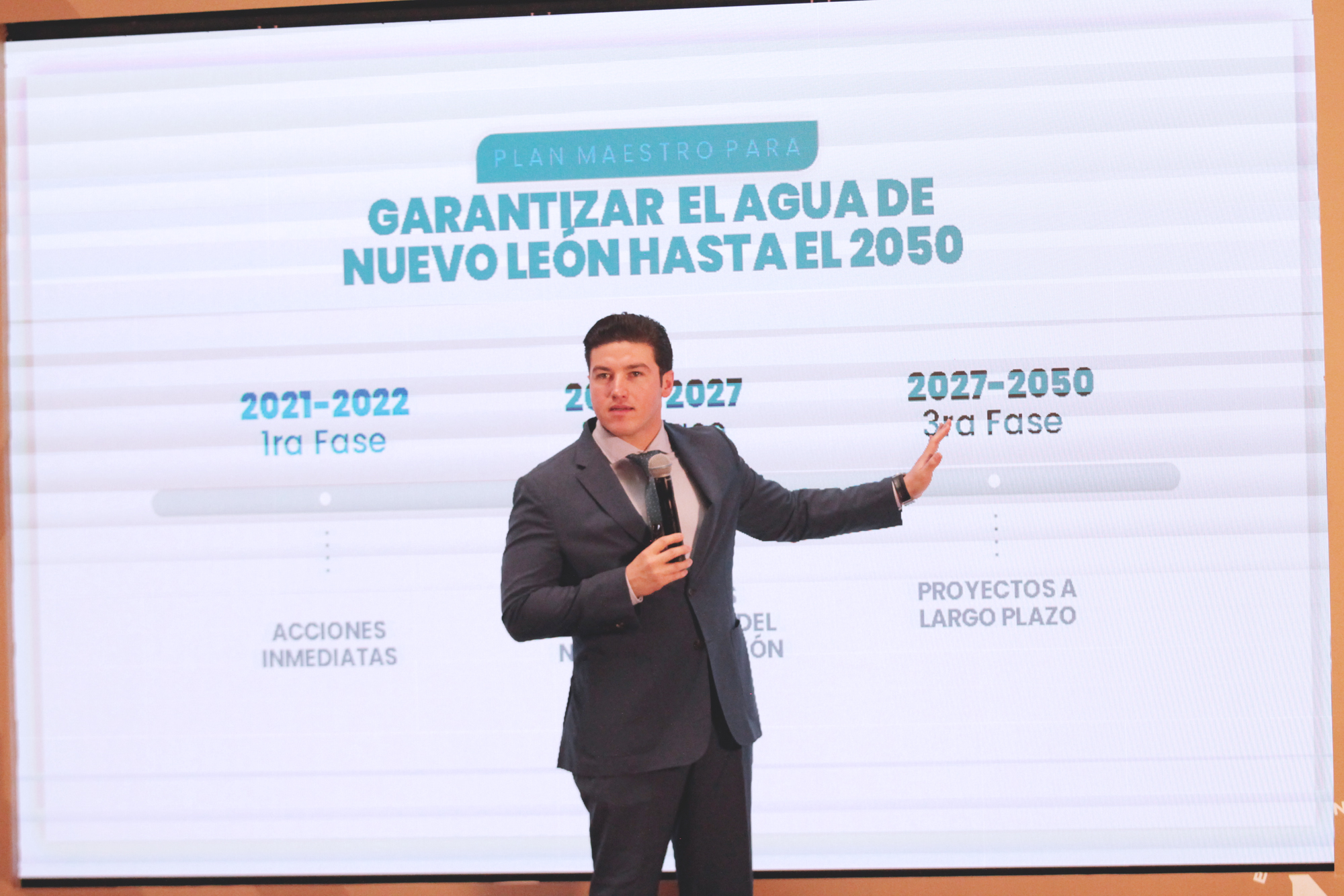 Acompañado de Juan Ignacio Barragán, director de Agua y Drenaje de Monterrey, el mandatario estatal explicó que actualmente la demanda del vital líquido en el área metropolitana es de 16 metros cúbicos por segundo, y con este plan se llegará a los 25 metros cúbicos en los próximos tres años.