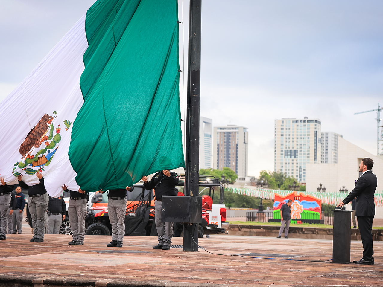 Acompañado del Secretario General de Gobierno, Miguel Ángel Flores Serna y del director de Protección Civil, Erik Cavazos, el Mandatario estatal condujo el acto cívico de honores e izamiento de Bandera a media asta en la Explanada de los Héroes.
