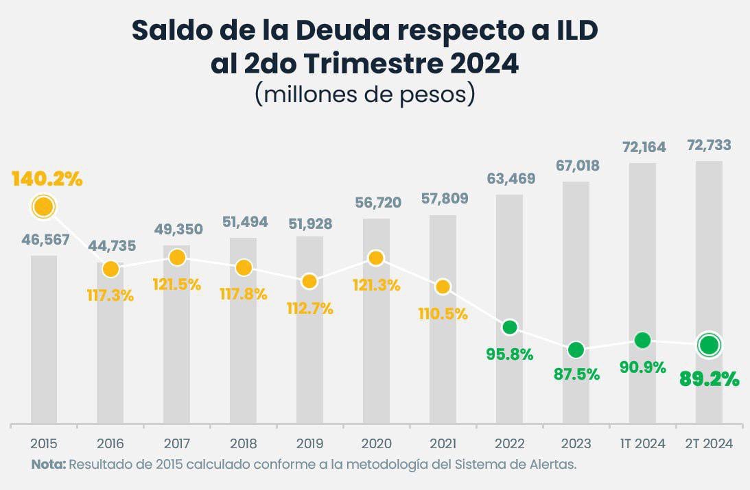 En contraste, en 2015, la deuda de Nuevo León era equivalente al 140.2 por ciento de los ILD y tenía la calificación de “En observación” conforme a la metodología de Sistema de Alertas.