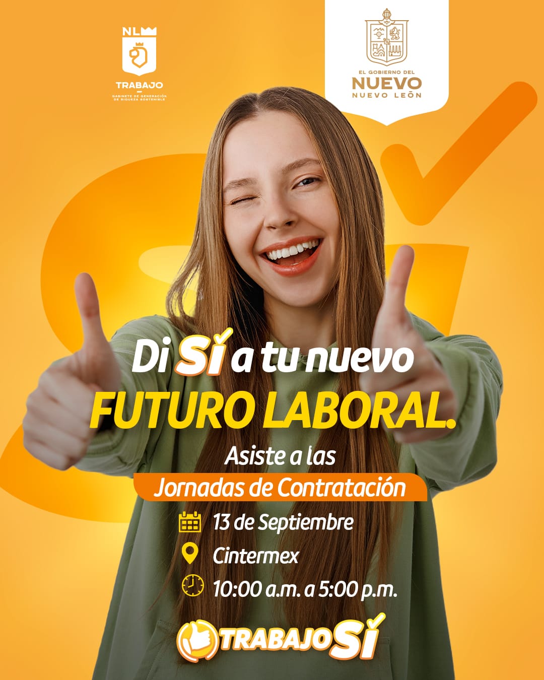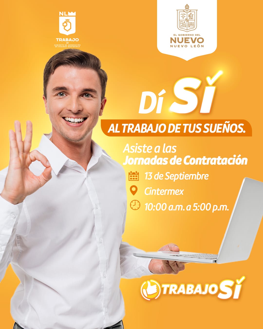 Con el objetivo de vincular a más profesionistas y técnicos al mercado laboral, la Secretaría del Trabajo realizará la primera Jornada de Contratación Trabajo Sí el próximo 13 de septiembre en la sala H de Cintermex, de 10 de la mañana a 5 de la tarde donde 60 empresas ofertarán alrededor de 2 mil vacantes de empleo.
