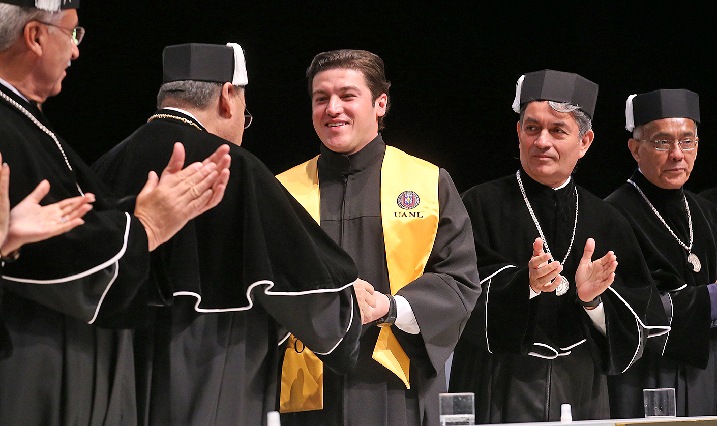 Previo al mensaje de García Sepúlveda, el Rector Santos Guzmán López mencionó que esta es la primera ocasión en la historia de la UANL que un Gobernador en funciones se titula con grado de Doctor.