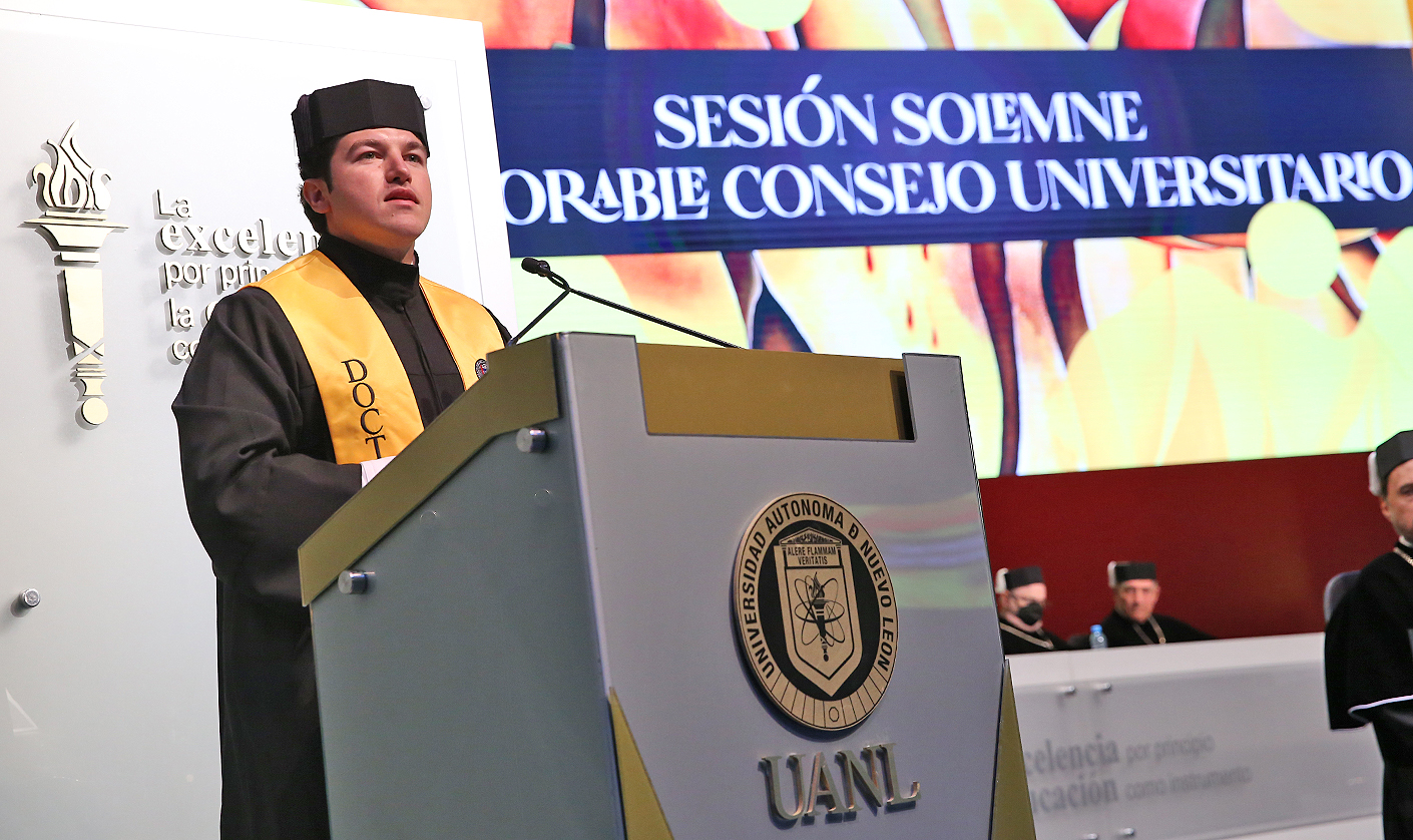 Al encabezar la Sesión Solemne del Honorable Consejo Universitario de la Universidad Autónoma de Nuevo León, el Gobernador Samuel Alejandro García Sepúlveda recibió su birrete y título de Doctor en Derecho con Orientación en Derecho Constitucional y Gobernabilidad con mención Summa Cum Laude, de manos del Rector Santos Guzmán López.