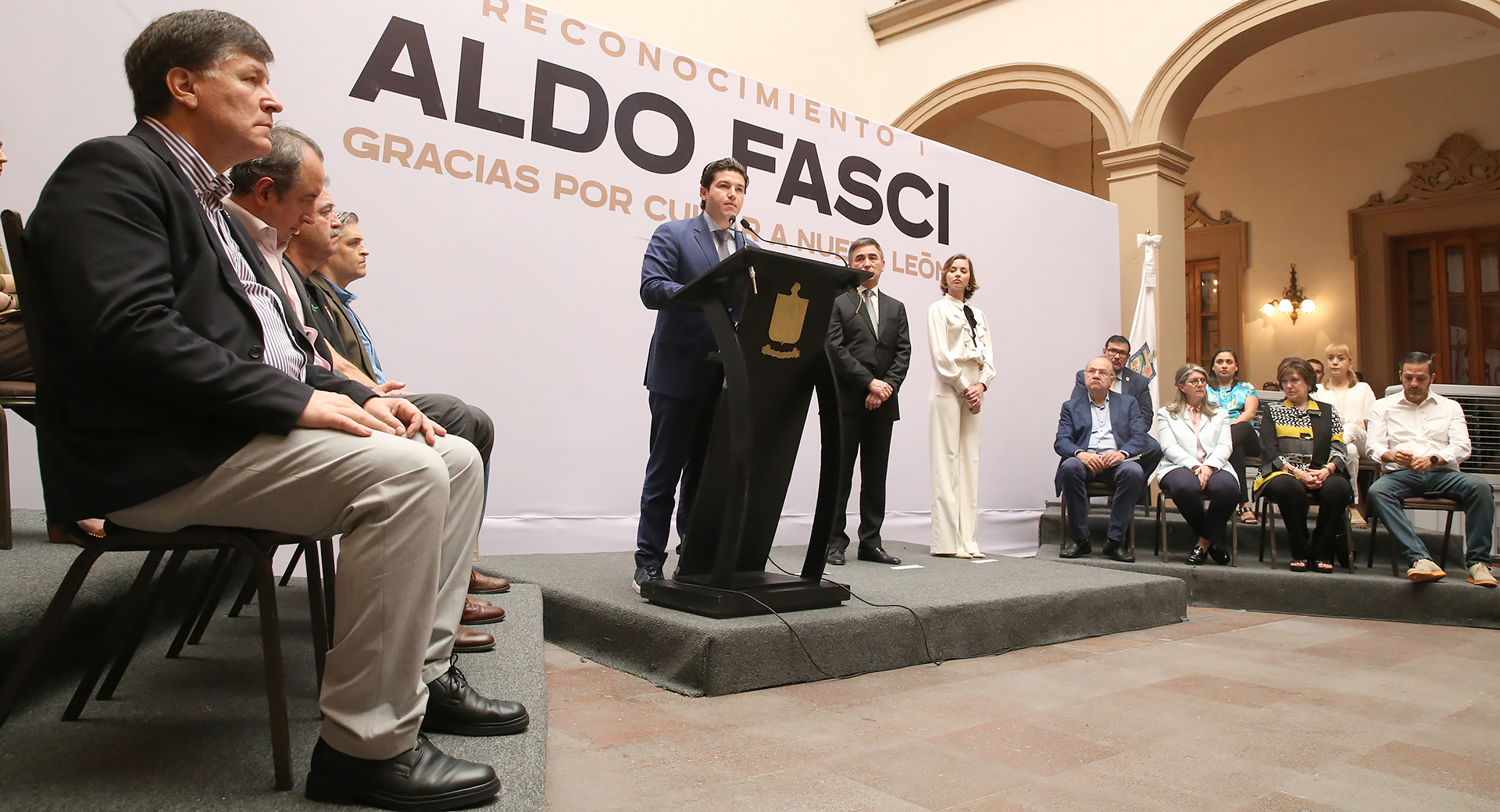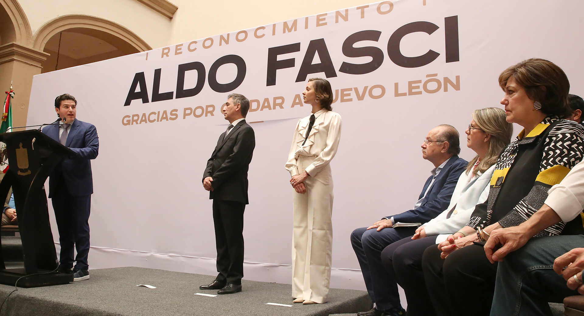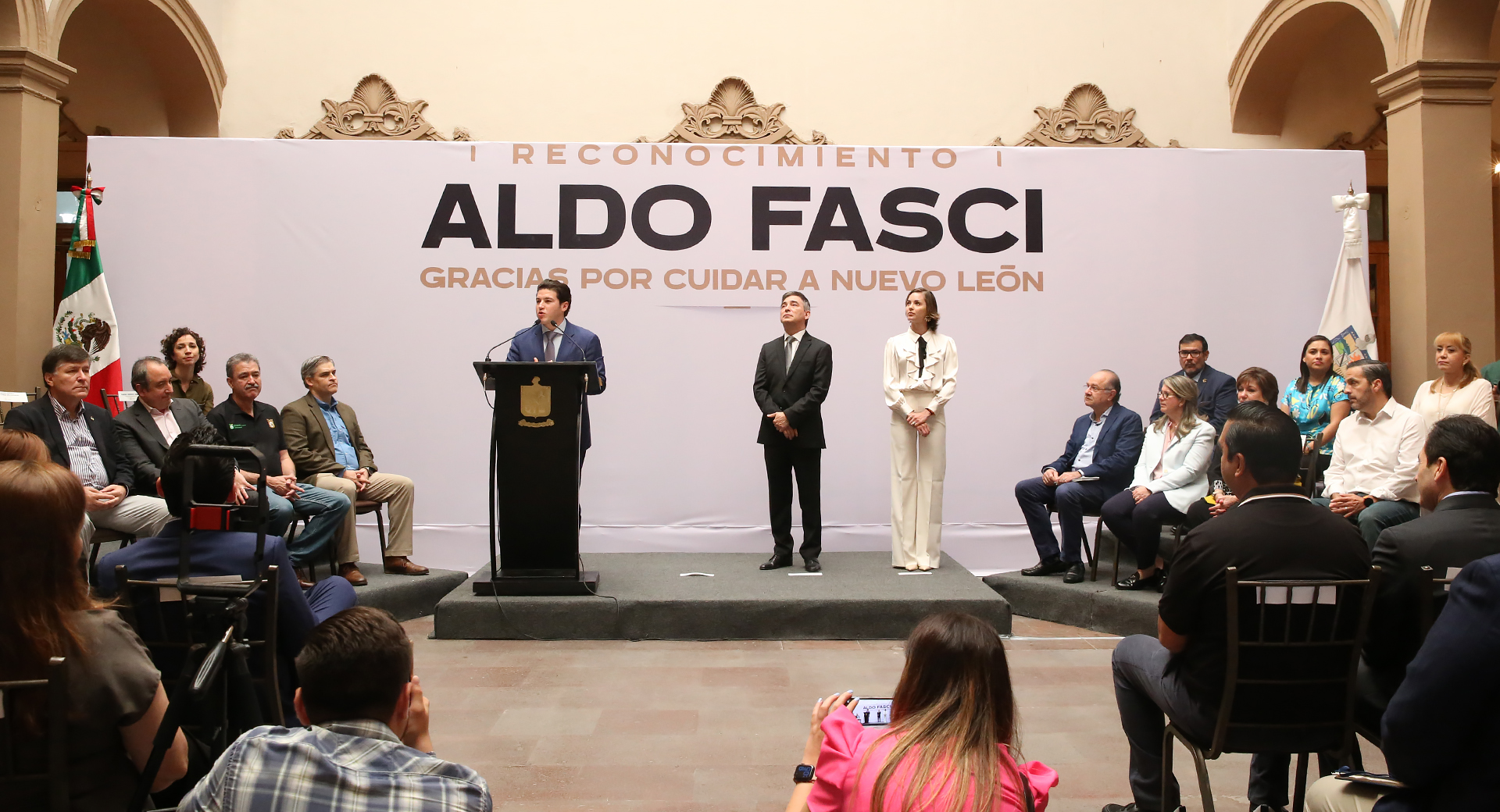 Al reconocimiento a Aldo Fasci asistió su familia, así como funcionarios del Gabinete Central y Ampliado, y funcionarios estatales, federales y municipales integrantes de la Mesa para la Seguridad de Nuevo León.