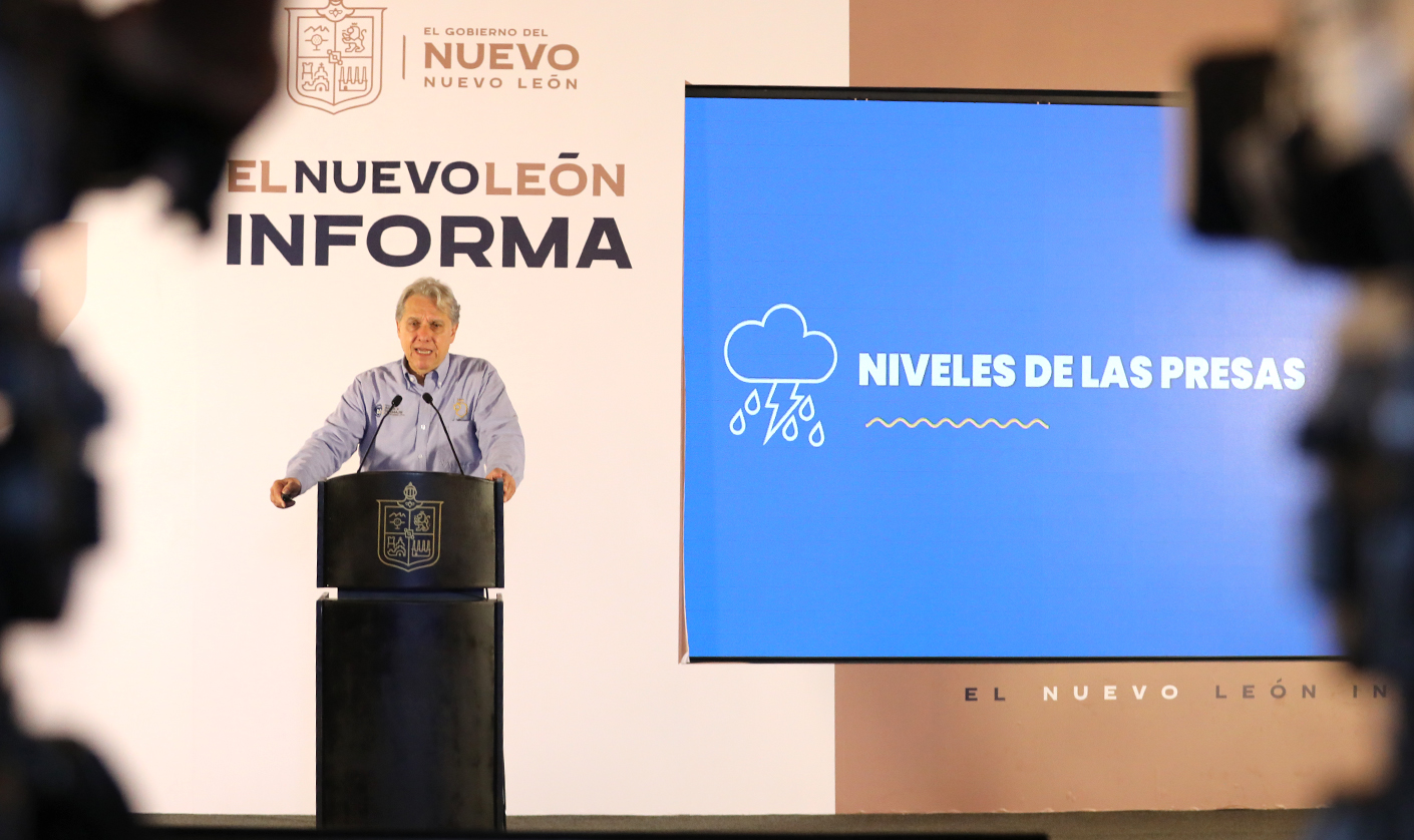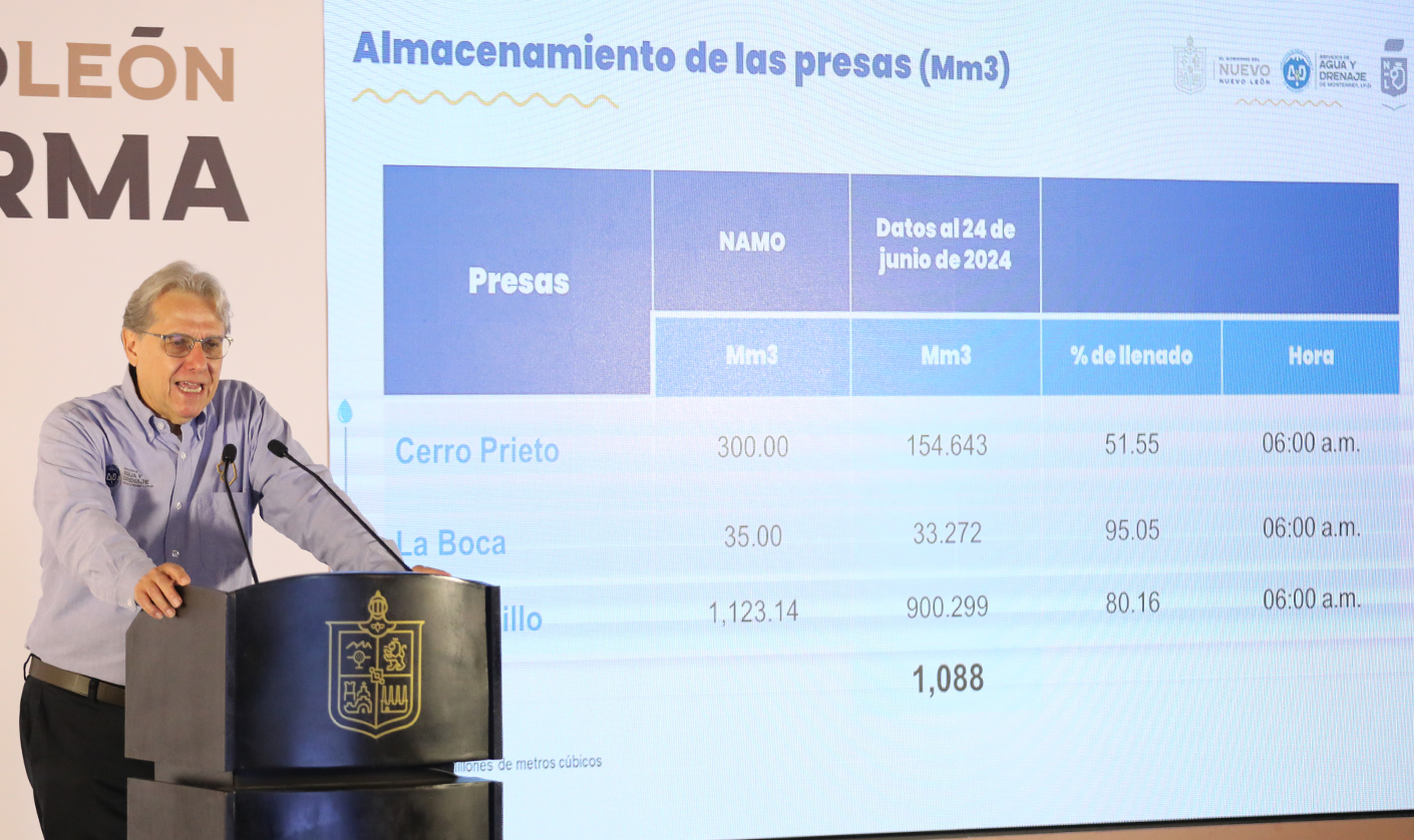 Dio a conocer que, hasta las 06:00 horas de este lunes, el nivel de las presas se mantiene de la siguiente manera: la Presa Cerro Prieto 154 millones de metros cúbicos para un llenado del 50 por ciento; La Boca 33 millones de metros cúbicos, un 95 por ciento de captación; El Cuchillo 900 millones de metros cúbicos, 80 por ciento de llenado; y La Libertad, 15 por ciento, lo que permite un volumen suficiente para varios años.