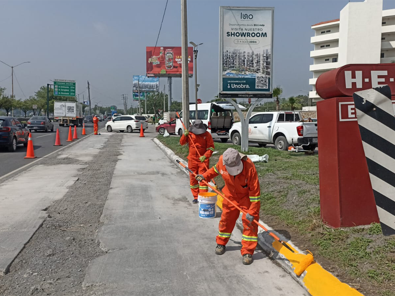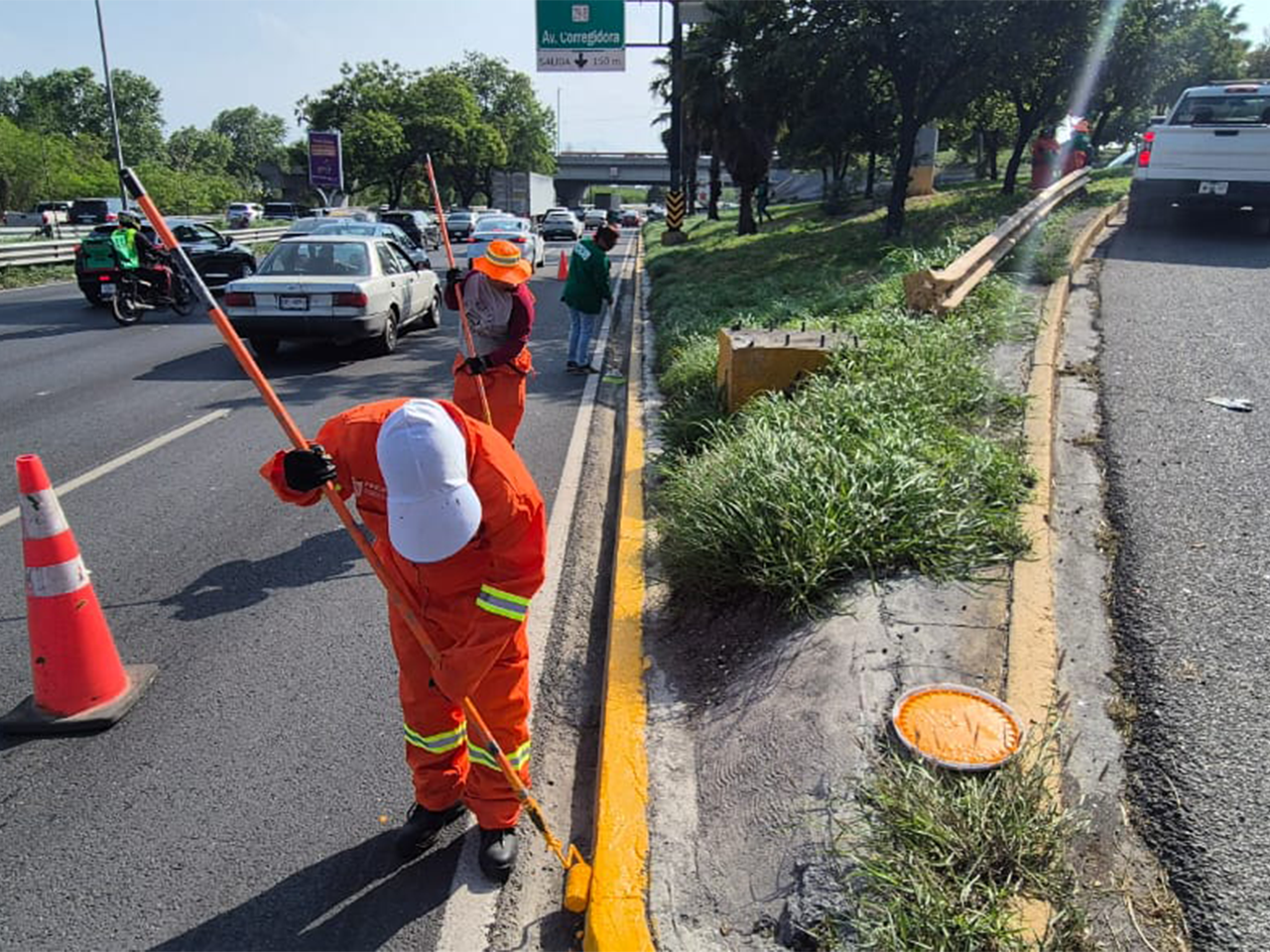 Entre los puntos más relevantes destacan la Avenida Constitución, en el tramo de Av. Bonifacio Salinas a Av. Gonzalitos, donde se continuaron los recorridos de limpieza en carriles ordinarios y exprés, además del refuerzo en zonas críticas, desbroce y pintura amarilla en el cordón vial de la lateral derecha.