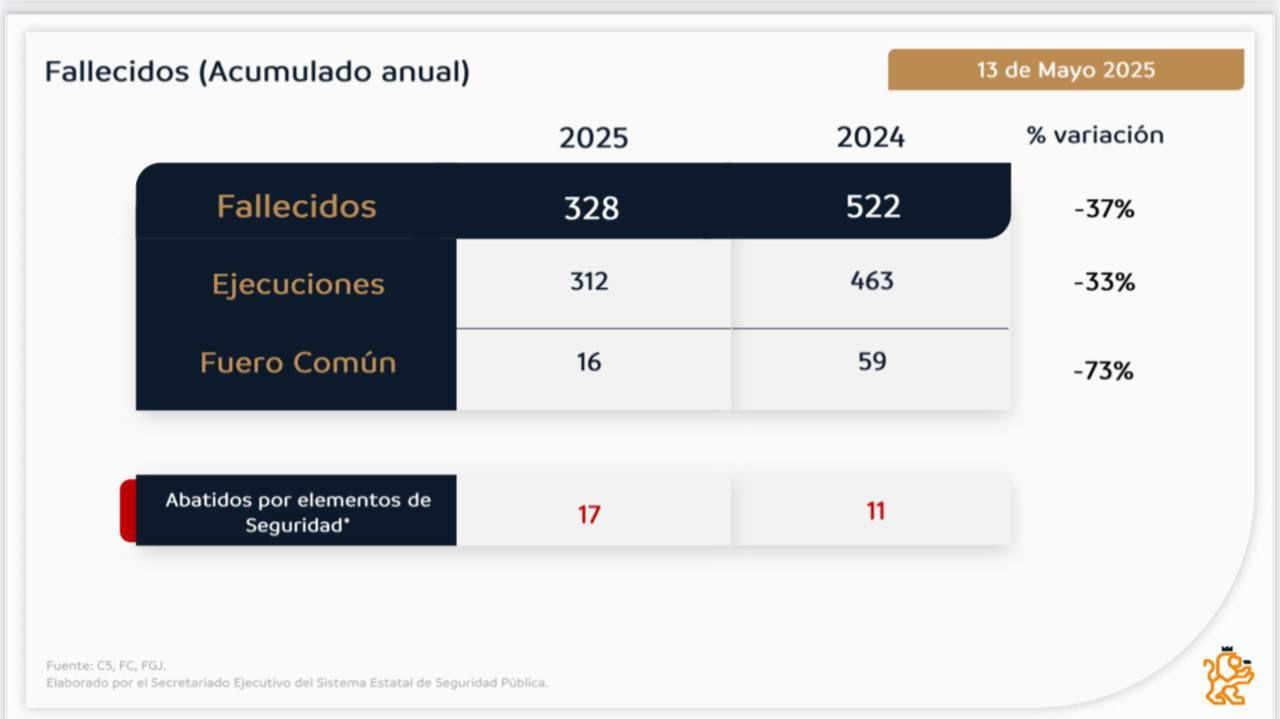 Al desglosar esta cifra, se destaca que los homicidios del fuero común, es decir, los no relacionados con la delincuencia organizada, se redujeron de 59 casos en el 2024 a 16 casos en el 2025, es decir una reducción del 73%.
