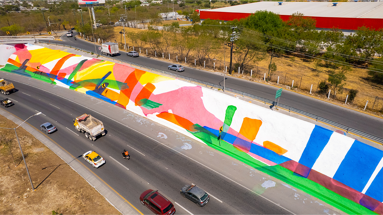 • La pieza "El dinamismo y la vitalidad de Monterrey" inaugura formalmente el Corredor FIFA; con mil 100 metros cuadrados, el mural de mayor extensión en este trayecto.