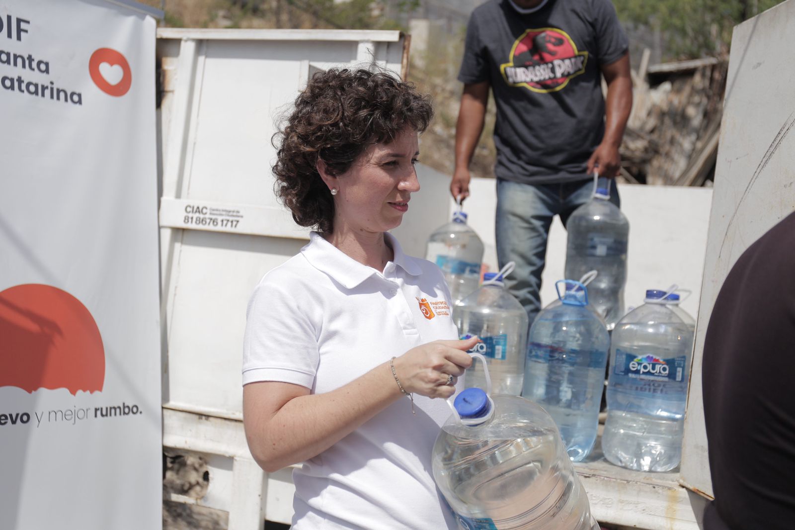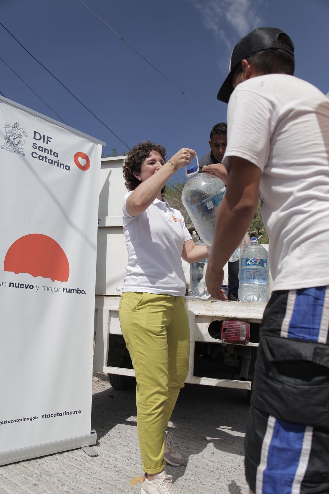 Ximena Peredo Rodríguez titular de la dependencia estatal, encabezó un recorrido por las zonas de La Ermita y La Cima, en el municipio de Santa Catarina, acompañada por la Presidenta del DIF Paola García Yves, donde entregaron botellones de 10 litros a familias residentes.