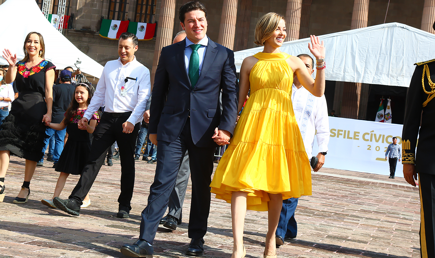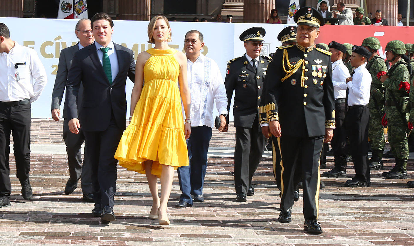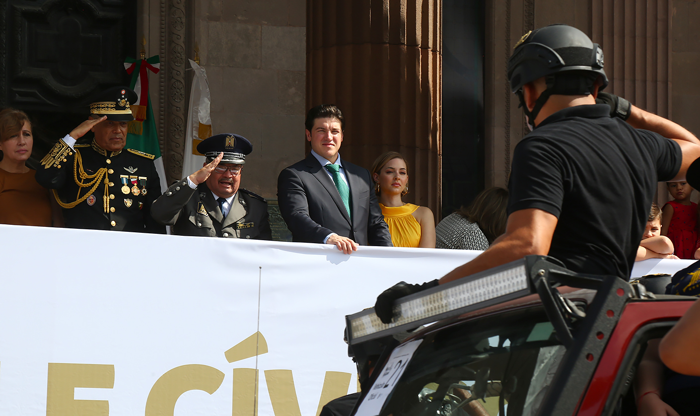 Luego de dar lectura al Acta de Independencia del 28 de septiembre de 1821, Samuel García, en su primer desfile de Independencia como Gobernador, atestiguó el paso de 32 contingentes conformados por más de 3 mil 422 personas, 26 bandas de guerra, 35 escoltas, 36 motociclistas y 43 elementos caninos, utilizando 4 plataformas, 17 bicicletas, 39 vehículos ligeros, 156 vehículos pesados y 64 caballos.