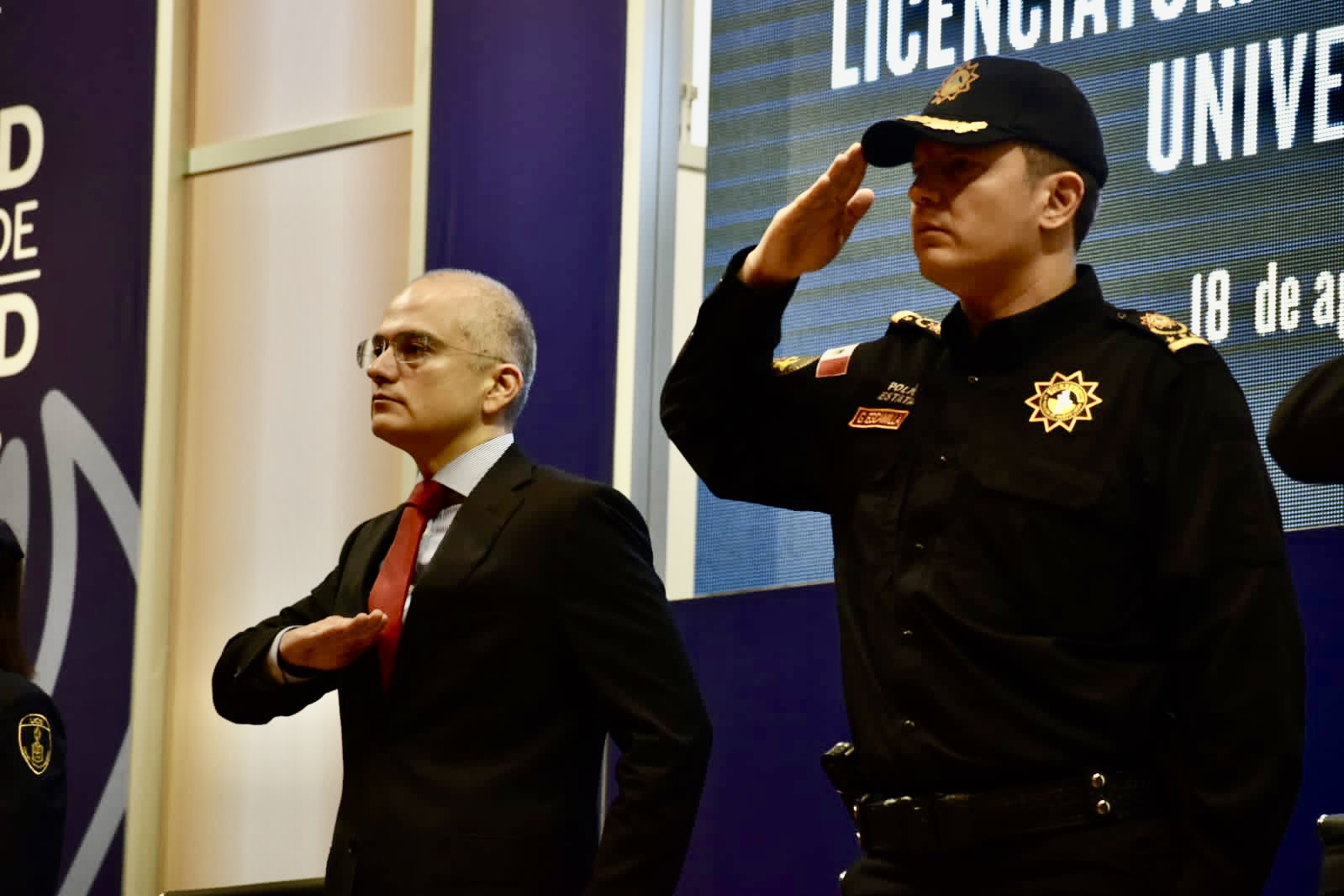 A la ceremonia de graduación también acudieron el Comisario de Fuerza Civil, Gerardo Escamilla, Olga Patricia Mena Treviño, Directora de Profesionalización de la Universidad de Ciencias de la Seguridad, y el Capitán Hamlet Álvaro Castilla García, Consejero Ciudadano, en representación de Ana María Esquivel Hernández, Presidenta Ejecutiva del Consejo Ciudadano de Seguridad Pública del Estado de Nuevo León; y el Maestro Octavio Carrera Santa Cruz, Presidente de la Comisión de Carrera Policial