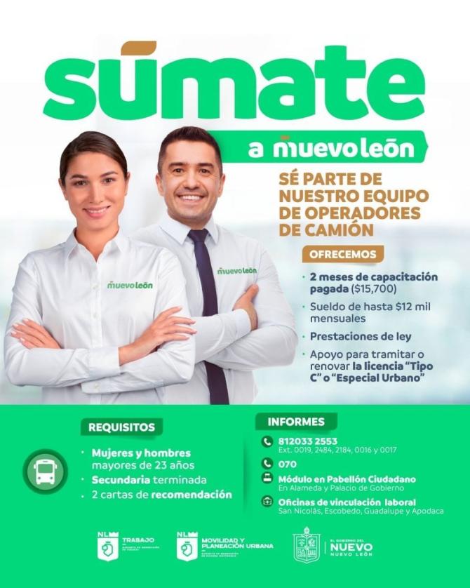 Nuevo León.- El Gobierno del Estado, a través de la Secretaría del Trabajo y la Secretaría de Movilidad y Planeación Urbana, invita a mujeres y hombres a ser parte del equipo de operadores de transporte urbano.