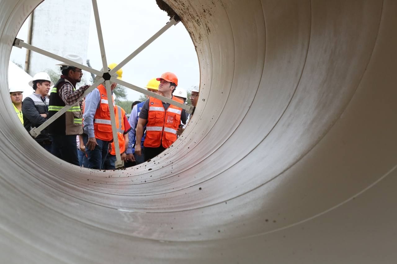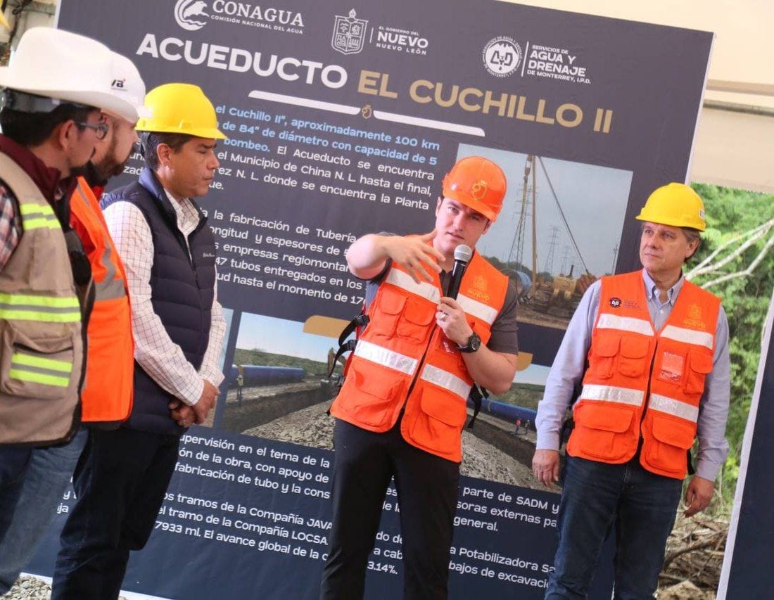 Tras supervisar la obra del Acueducto El Cuchillo II en el municipio de Juárez, el Gobernador Samuel Alejandro García Sepúlveda agradeció el apoyo y la coordinación de la Federación, la iniciativa privada y las empresas que participan en el proyecto hídrico.