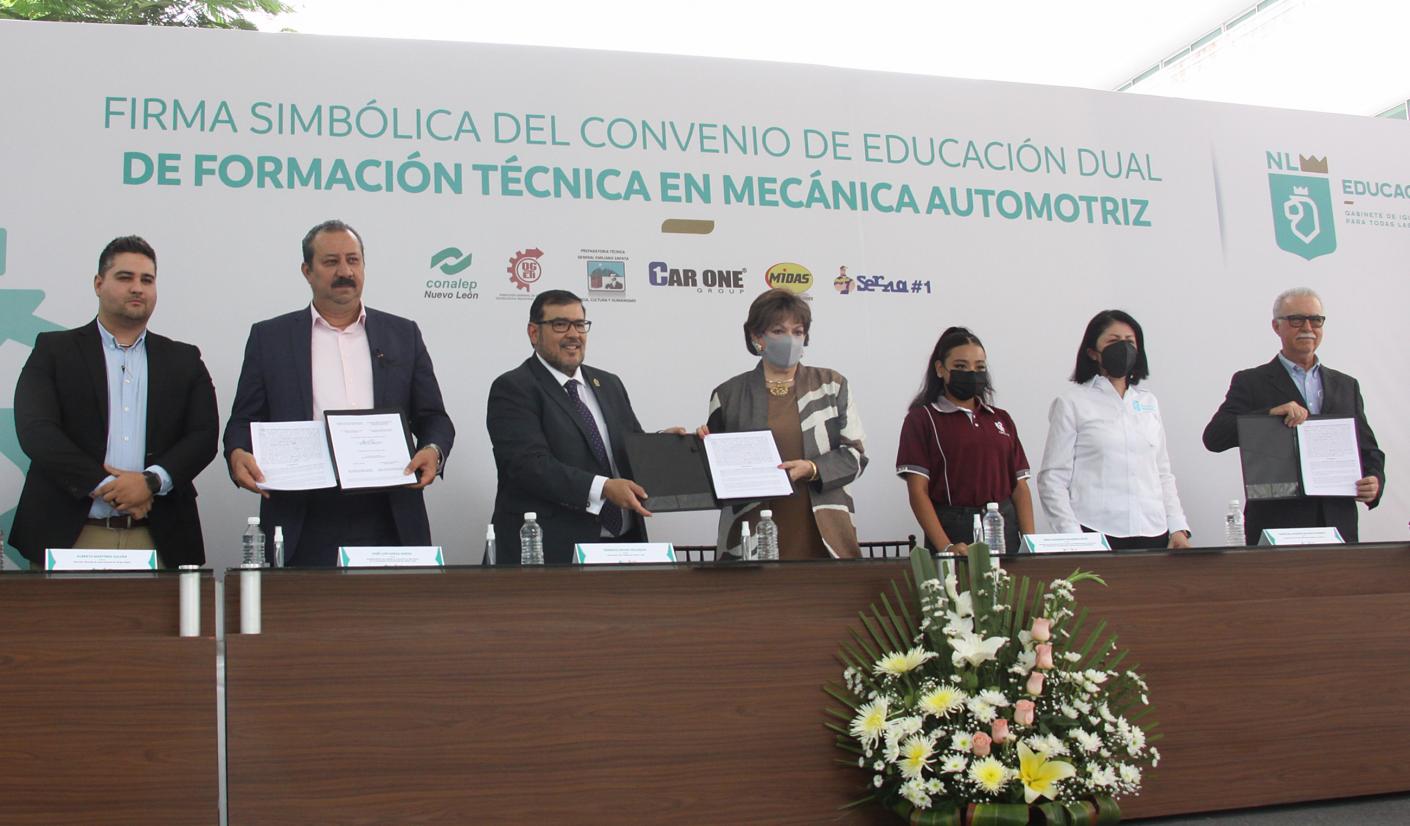 Buscando impulsar a la educación dual en Nuevo León, la Secretaría de Educación firmó un convenio de colaboración con la iniciativa privada para que 96 alumnos provenientes de carreras de mecánica automotriz pongan en práctica sus conocimientos. El acuerdo es el más grande en educación dual que se ha firmado en el país.