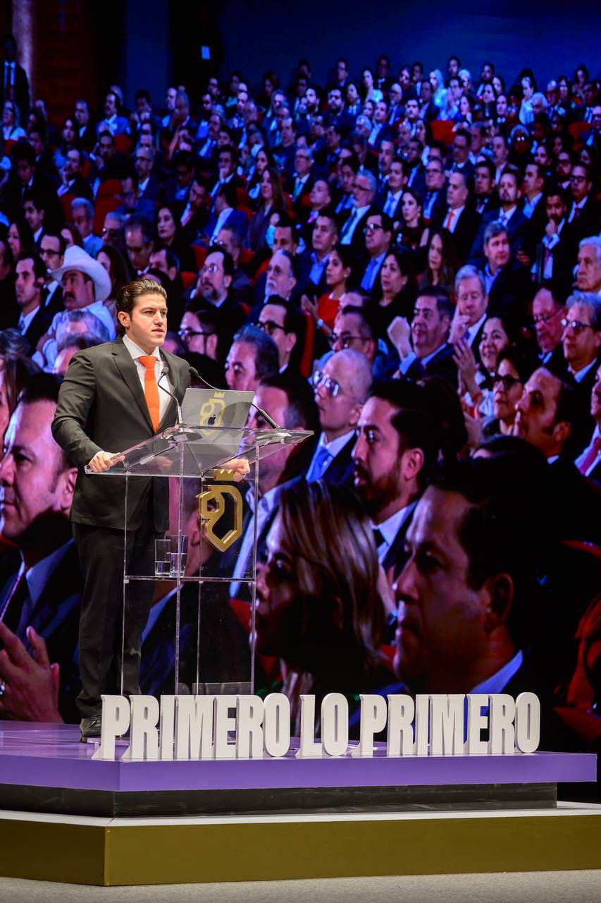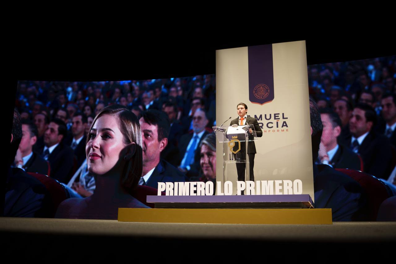 Arropado por Mariana Rodríguez, de AMAR a Nuevo León, funcionarios de la Federación, Gobernadores, ex Gobernadores, Secretarios y Secretarias de Estado, Senadoras, Senadores, Diputadas y Diputados federales y locales, representantes de los tres niveles de Gobierno, del Ejército Mexicano, empresarios y sociedad civil, el Mandatario destacó los logros y el estado que guarda la Administración Pública, así como el ejemplo que representa Nuevo León para el país.