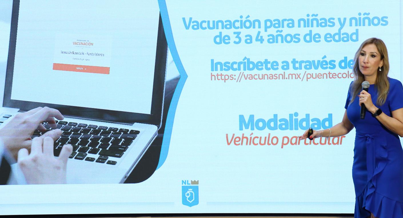 "Ya lo anunciaba nuestro Gobernador ayer, tenemos la fortuna de iniciar con esta estrategia de Vacunación Transfronteriza, a través de la Ruta Colombia, para niños; y en esta primera etapa, de 3 a 4 años de edad", dijo, y solicitó a madres y padres de familia registrar a sus hijas e hijos en la plataforma www.vacunasnl.mx/puentecolombia.