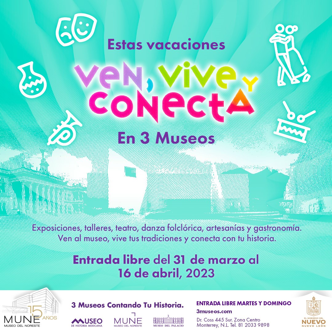 Estas vacaciones, ven. vive, conecta con tu historia en 3 Museos del 31 de marzo al 16 de abril, la entrada a los museos será gratuita, si desea más información puede consultar la página www.3museos.com o ponerse en contacto a través de las redes sociales.