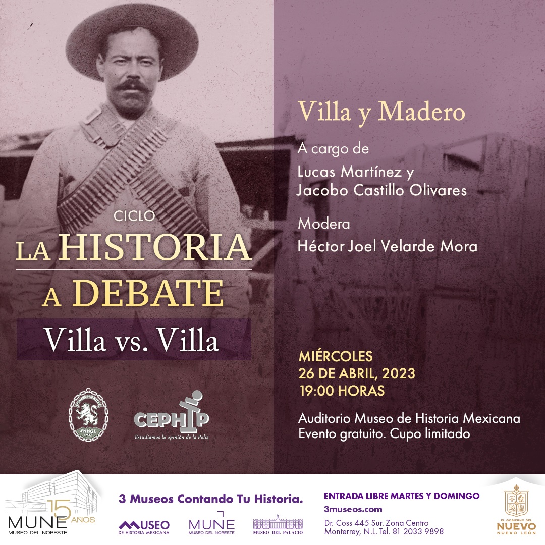 Villa y Madero, una relación marcada por la lealtad y la traición, será el debate que protagonizarán los historiadores Lucas Martínez y Jacobo Castillo Olivares, bajo la moderación de Héctor Joel Velarde Mora, el miércoles 26 de abril a las 19:00 horas en el Museo de Historia Mexicana.