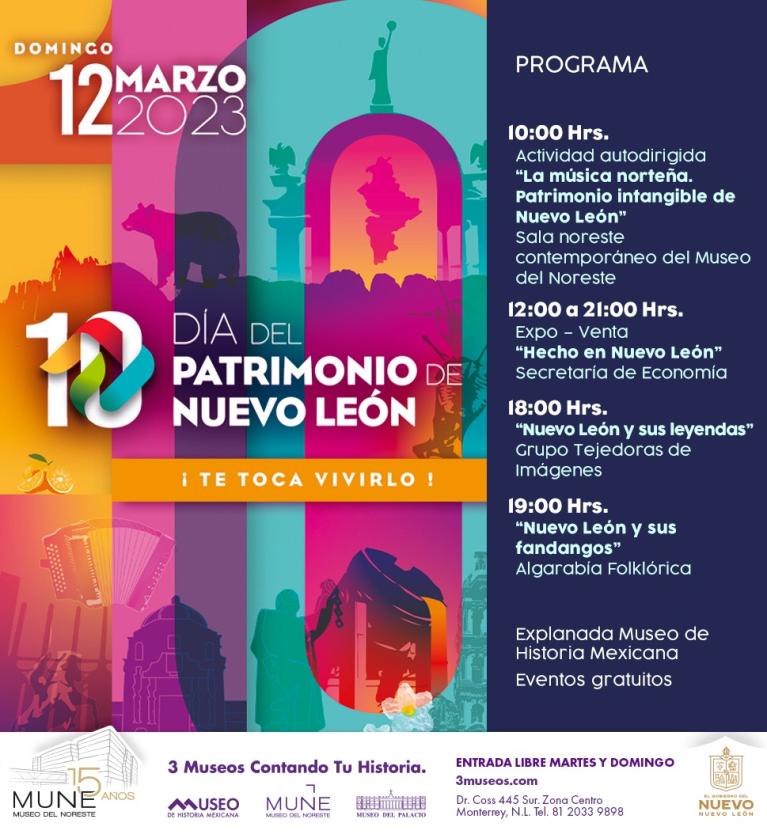 Monterrey, Nuevo León.- El Día de Patrimonio de Nuevo León vive las grandes tradiciones nuevoleonesas a través de sus danzas, música, cuentos y leyendas, gastronomía y productos artesanales, el domingo 12 de marzo en el Museo de Historia Mexicana y el Museo del Noreste, a partir de las 10:00 horas.