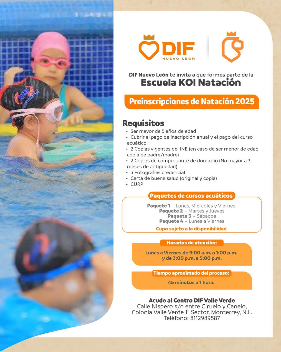 Si tienes hijos mayore de 5 años y deseas que aprendan a nadar, ya puedes preinscribirlos en las clases que se realizarán en la alberca del Centro DIF Valle Verde. Consulta los requisitos y los paquetes de clases en el póster informativo.