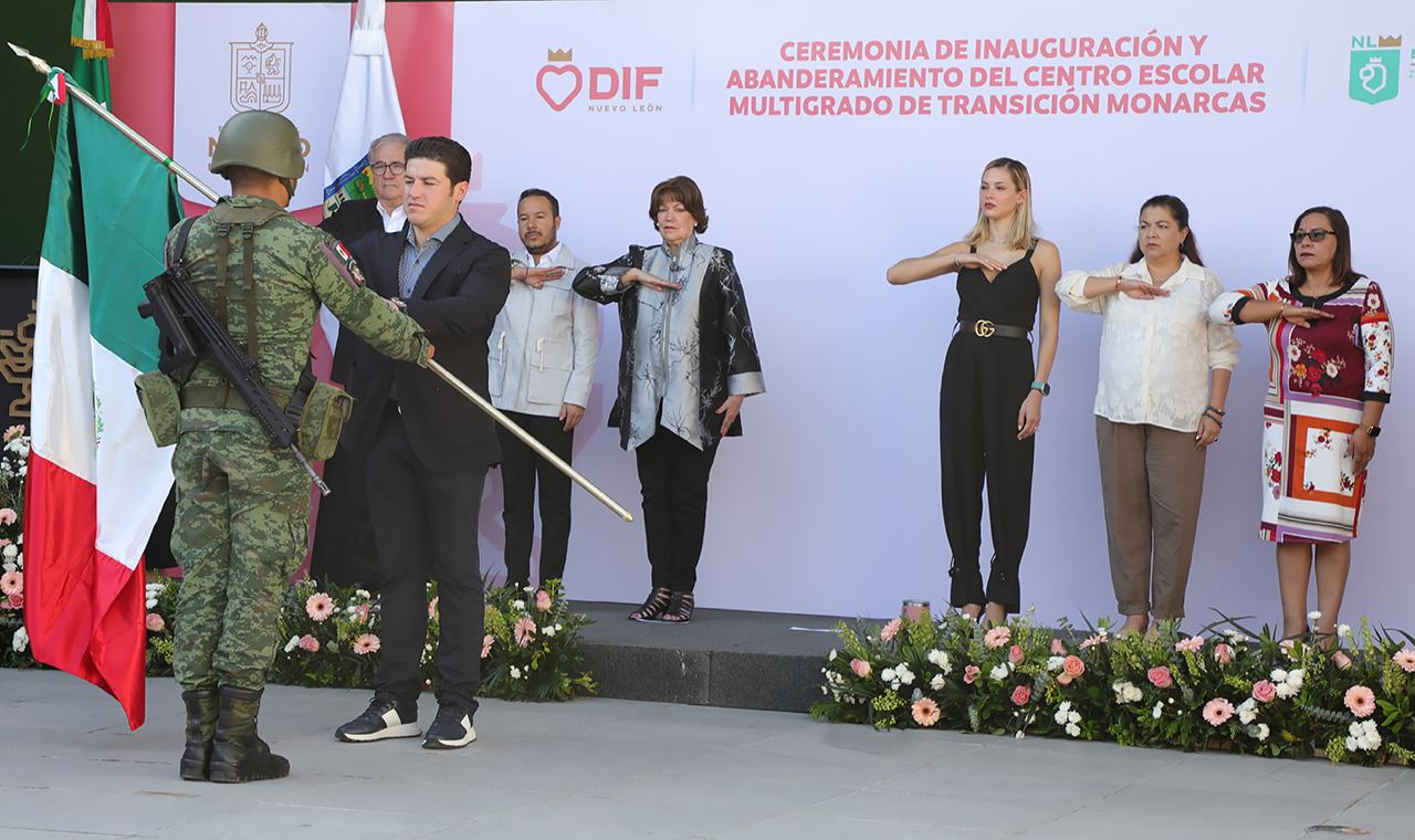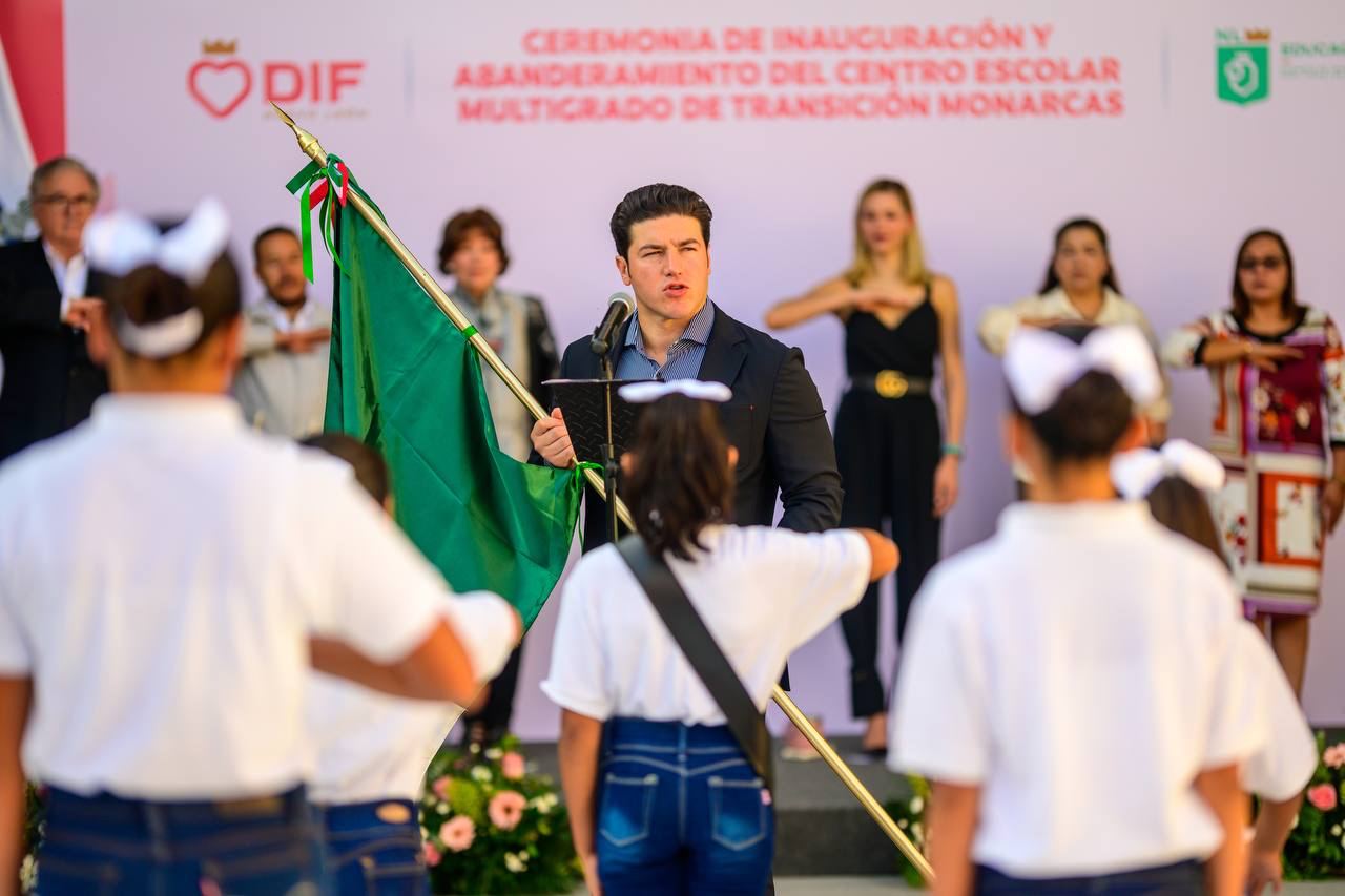 “Este será un mejor año, este ciclo 2023-2024 es muy prometedor y el Estado de Nuevo León está haciendo todo en sus manos para que desde los más pequeños, hasta los más grandes, todos salgan adelante con el potencial que tiene nuestro estado”, expresó García Sepúlveda en su discurso tras el acto protocolario de abanderamiento.