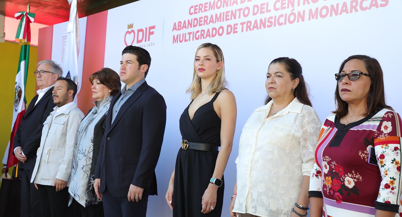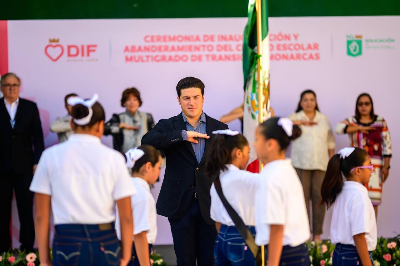 Abanderan Samuel García y Mariana Rodríguez a niñas y niños del Centro Escolar Multigrado de Transición Monarcas
