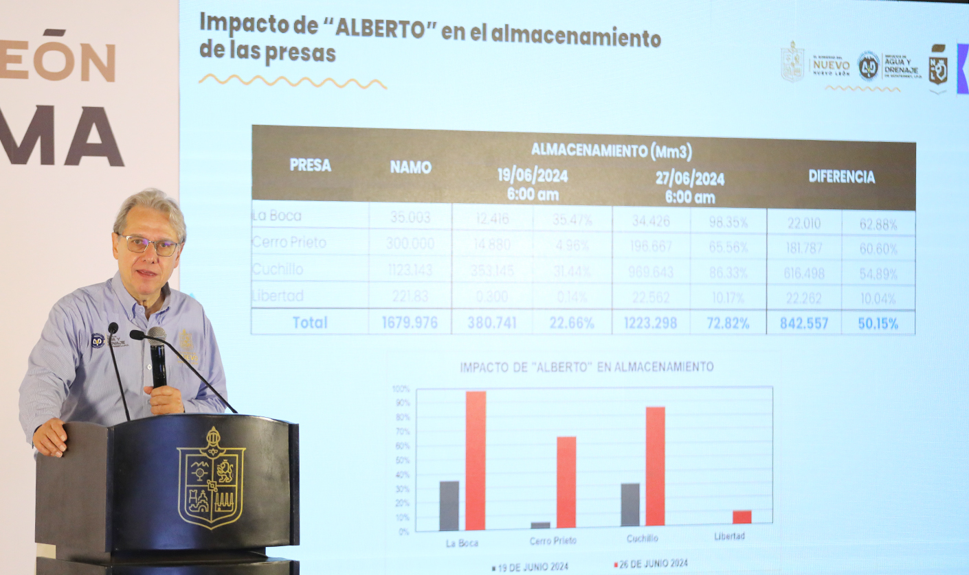 Indicó que hasta el momento se tiene un nivel de almacenamiento en las presas Boca, Cuchillo y Cerro Prieto de mil 223 millones de metros cúbicos, lo que da cierta tranquilidad para la ciudad en los próximos dos años.