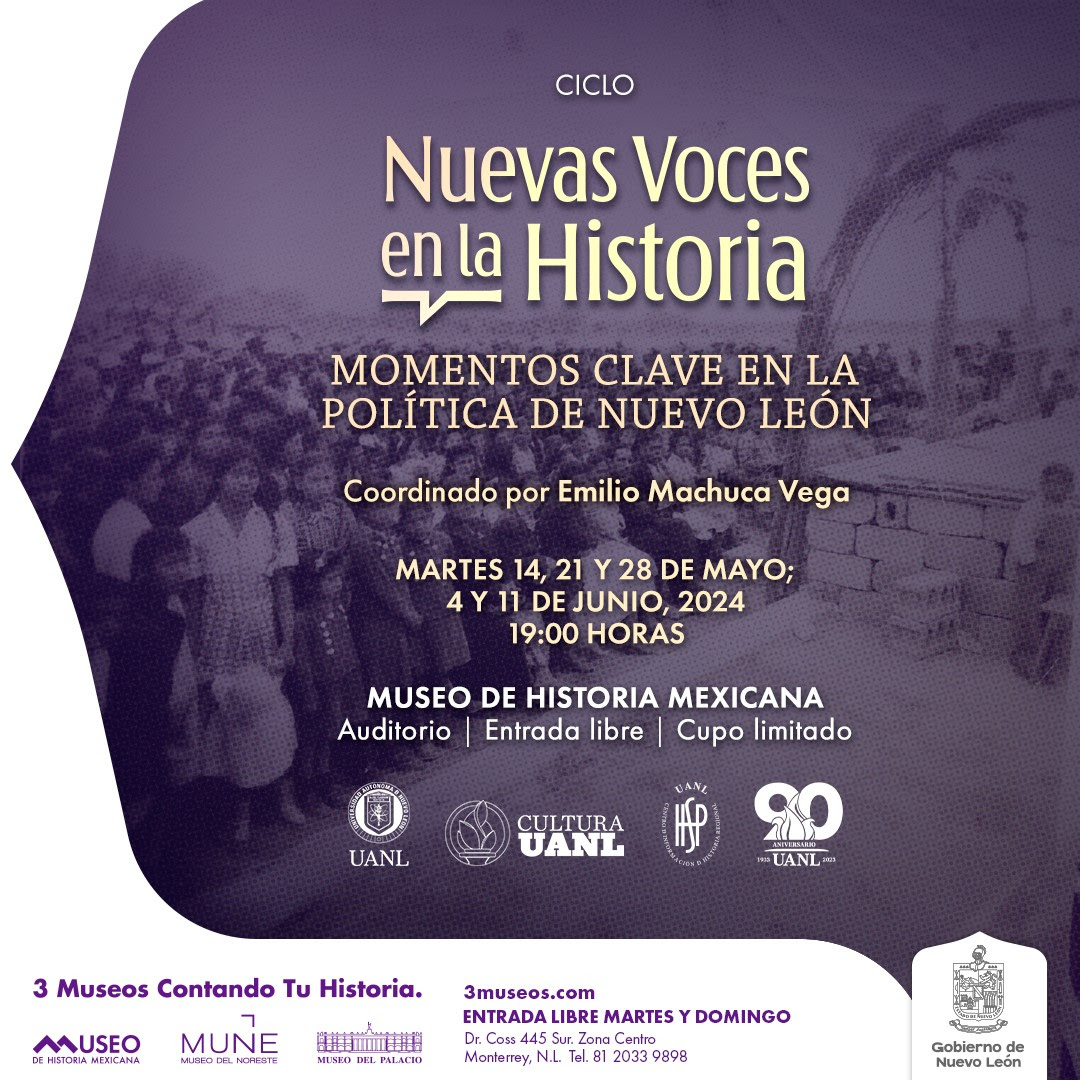 El ciclo Nuevas voces en la historia. Momentos clave en la política de Nuevo León, se realizará los martes del 14 de mayo al 11 de junio a las 19:00 horas, en el Museo de Historia Mexicana, si desea más información pude consultar la página www.3museos.com.