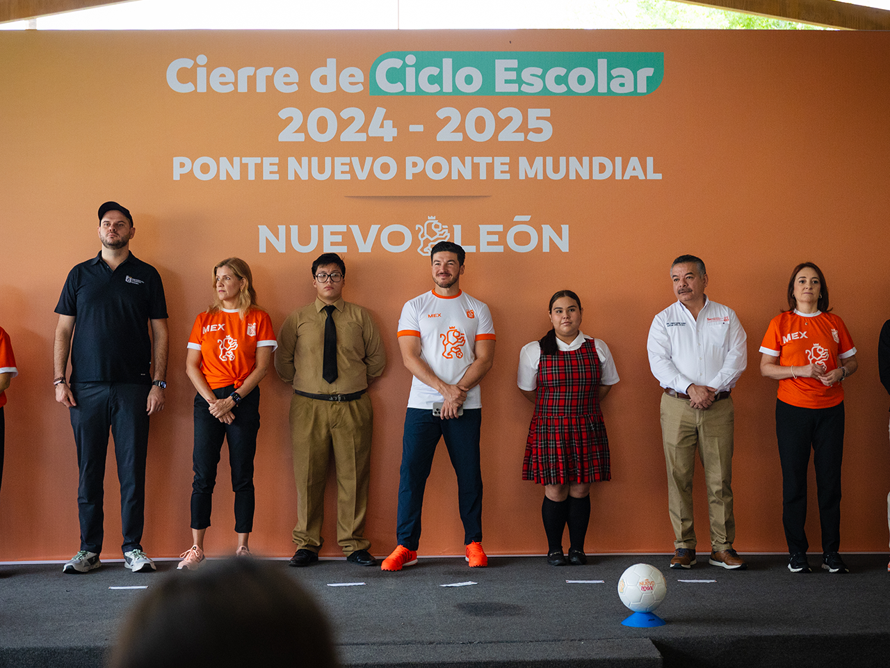 Monterrey, Nuevo León.-  A ritmo del Mundialito, el Gobernador del Estado, Samuel Alejandro García Sepúlveda encabezó la ceremonia de cierre del Ciclo Escolar  2024-2025, en el que más de un millón 56 mil alumnas y alumnos de Educación Básica concluyeron sus clases.
