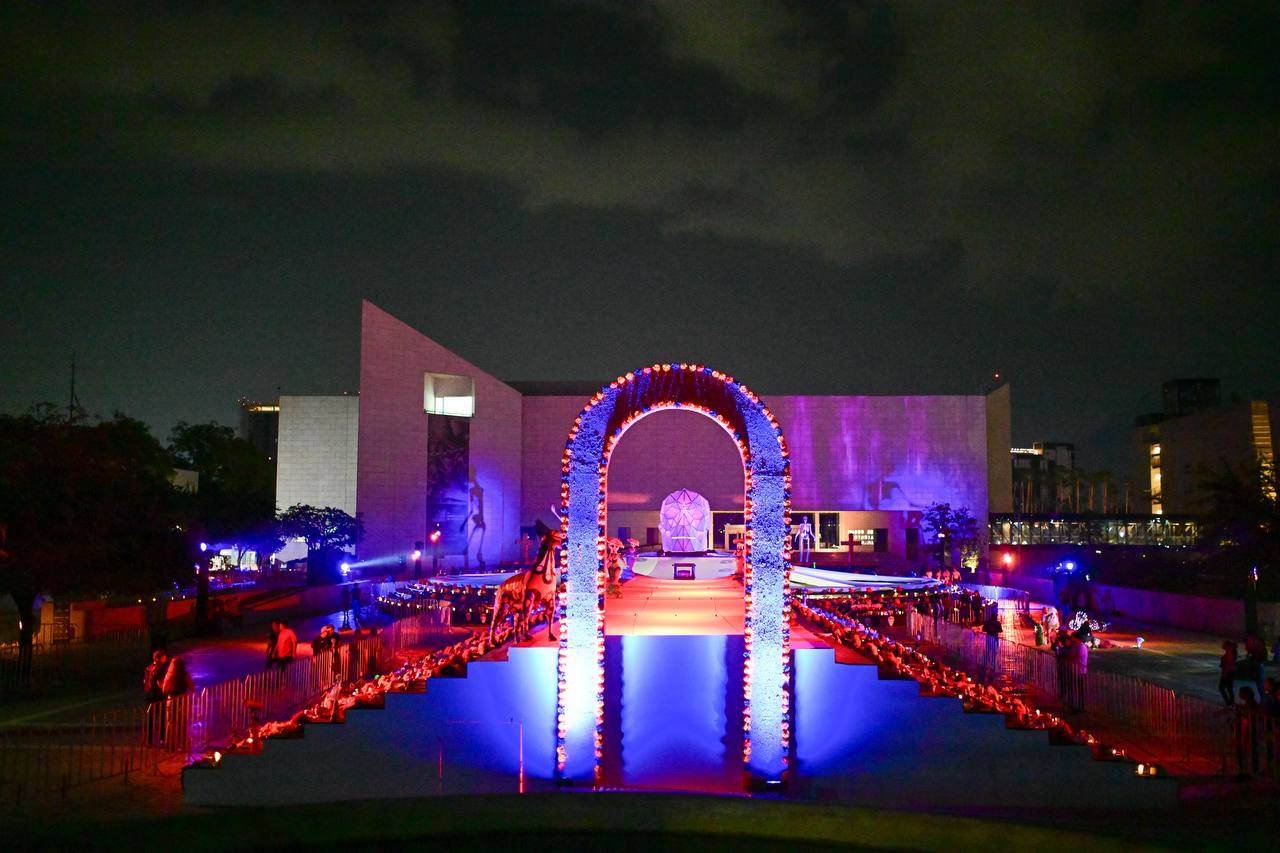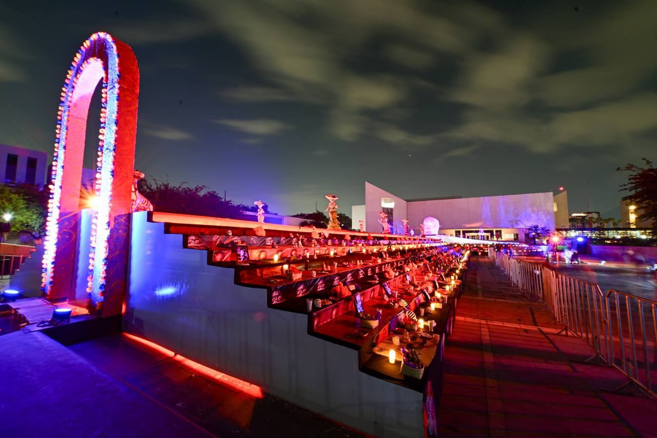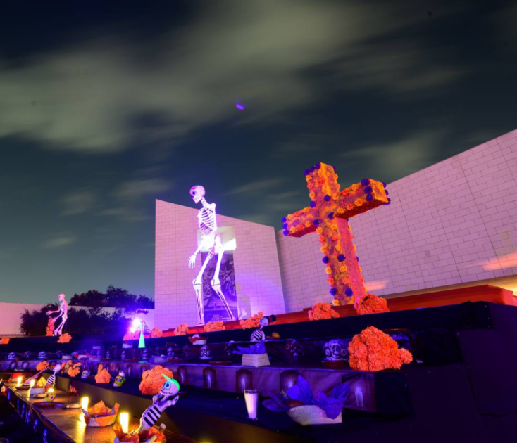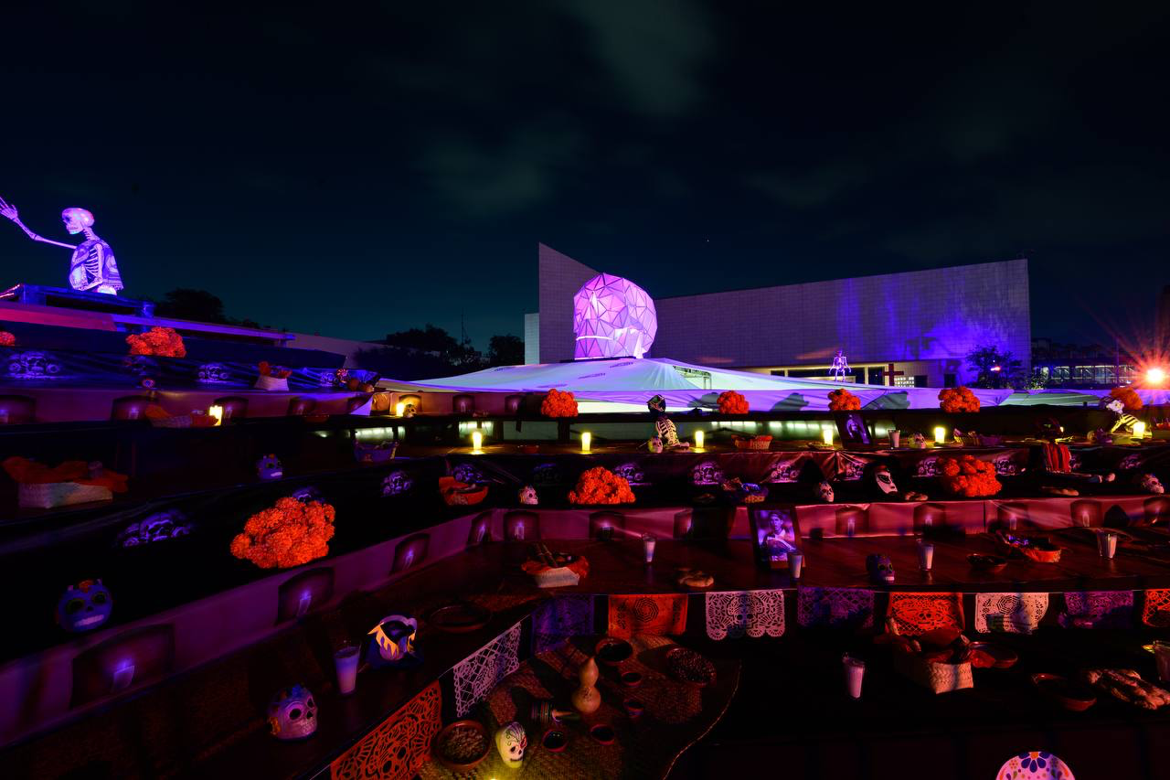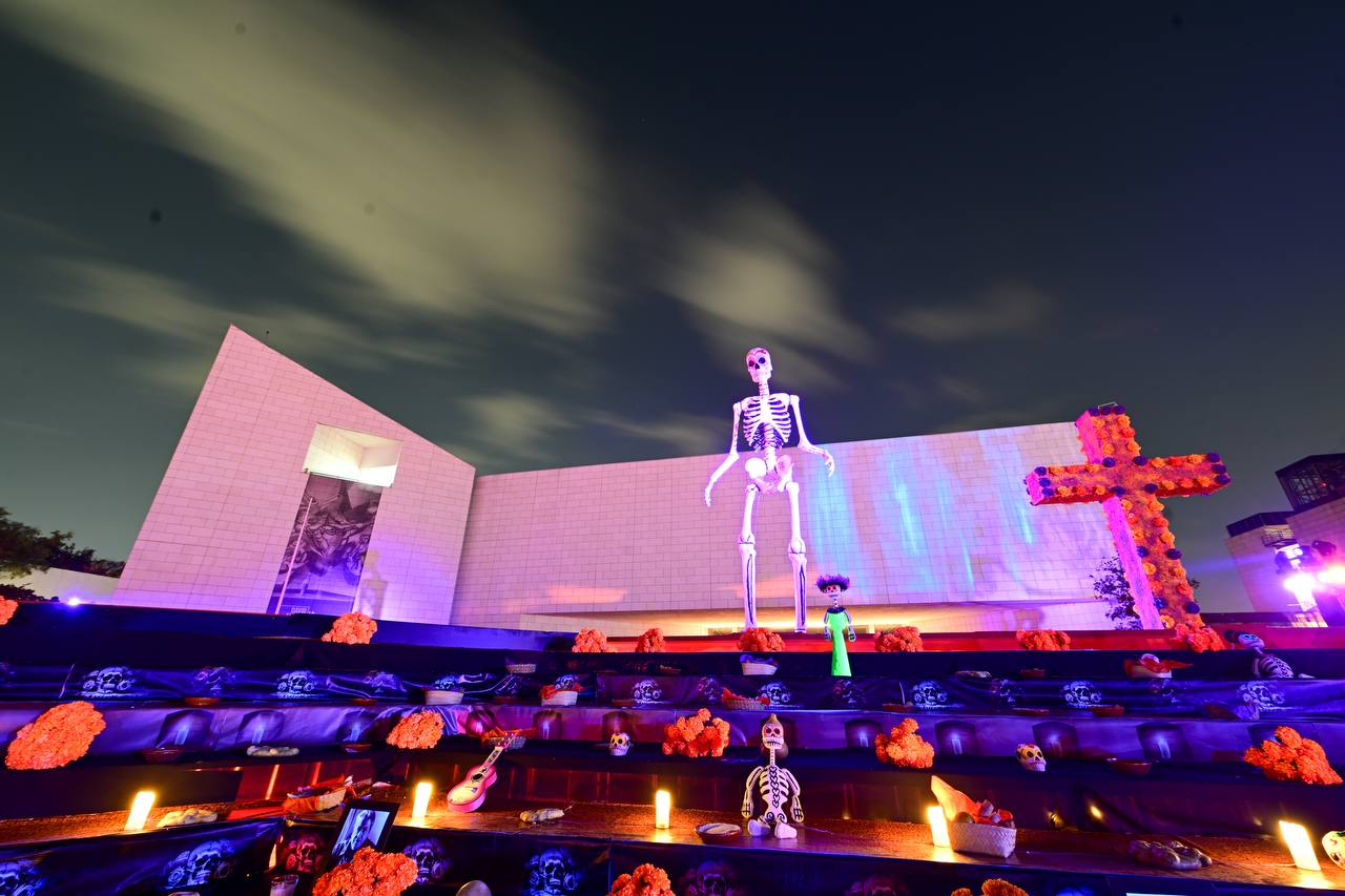 “El altar presenta una combinación única de elementos tradicionales, como flores de cempasúchil, calaveras de azúcar, pan de muerto, mezcal y velas, con la tecnología moderna, incluyendo un espectacular show de videomapping proyectado sobre un cráneo gigante, que será visto en horarios de 19:30, 20:30 y 21:30 horas y hasta el 5 de noviembre.