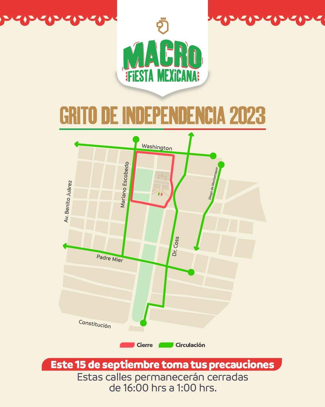 El cierre de vialidades para este 15 de Septiembre se realizará en las calles Zuazua, Zaragoza, Juan Ignacio Ramón y Washington.
