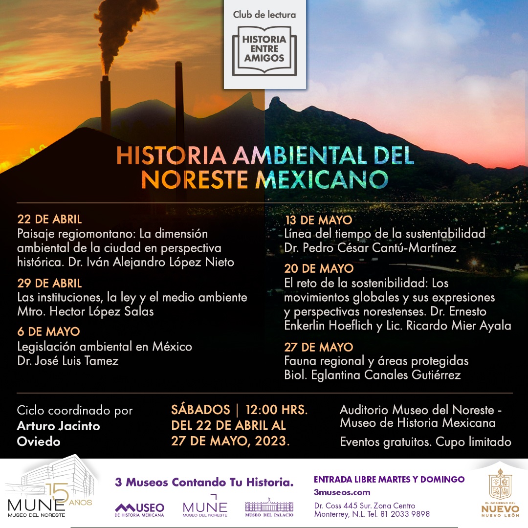 El conocimiento histórico de la biodiversidad y de los recursos naturales de la región, proporciona elementos para comprender las características sociales y de identidad; legislación, geografía, desarrollo industrial, biodiversidad, fenómenos meteorológicos y desastres naturales, por estas razones el Museo de Historia Mexicana invita al ciclo Historia ambiental del noreste mexicano, que se realizará los sábados del 22 de abril al 27 de mayo de 2023.