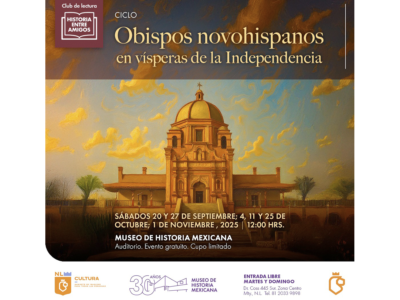 Todas las sesiones, ciclo “Obispos novohispanos en vísperas de la Independencia” se llevarán a cabo en el Museo de Historia Mexicana los sábados del 20 de septiembre al 1 de noviembre a las 12:00 horas.