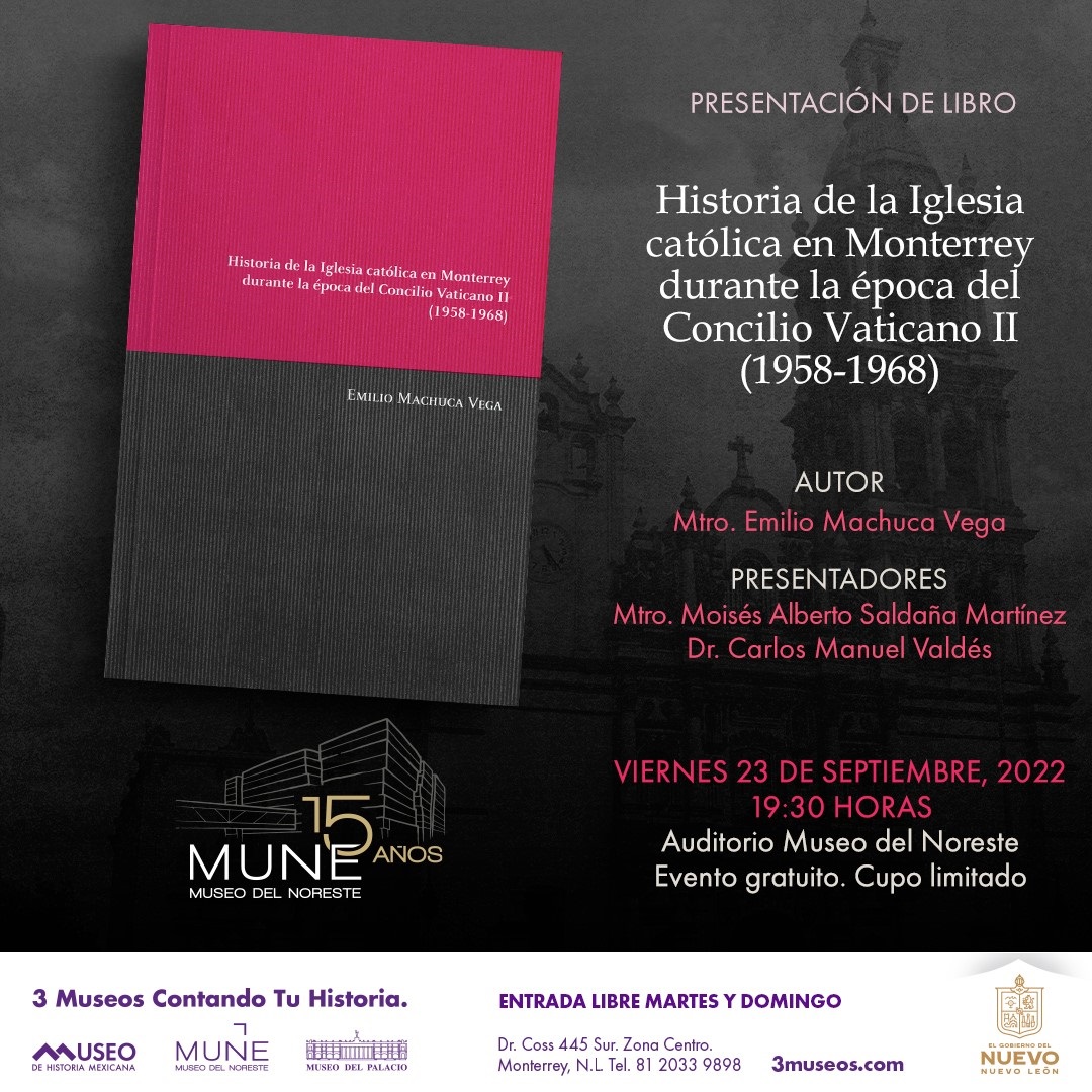 El libro Historia de la Iglesia católica en Monterrey durante la época del Concilio Vaticano II (1958-1968) del Mtro. Emilio Machuca Vega, investigación ganadora de la cuarta edición del Premio Museo de Historia Mexicana, se presentará en el auditorio del Museo del Noreste, el viernes, 23 de septiembre a las 19:30 horas