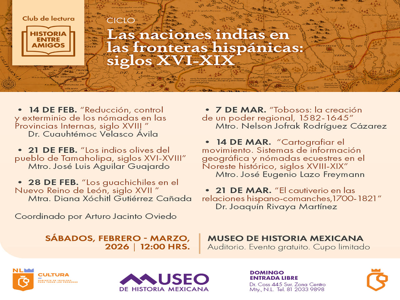 Monterrey, Nuevo León.- “Las naciones indias en las fronteras hispánicas: siglos XVI–XIX”, será el nuevo Club de Lectura Historia entre Amigos, con la participación de especialistas en historia de las fronteras e instituciones hispánicas, quienes compartirán sus investigaciones más recientes sobre el tema, los sábados del 14 de febrero al 21 de marzo, a las 12:00 horas en el Auditorio del Museo de Historia Mexicana.
