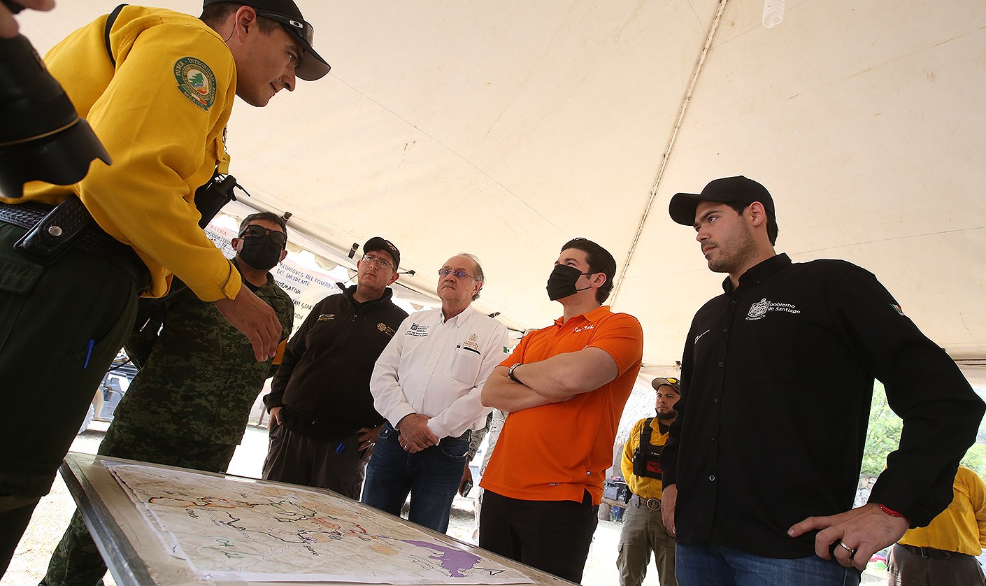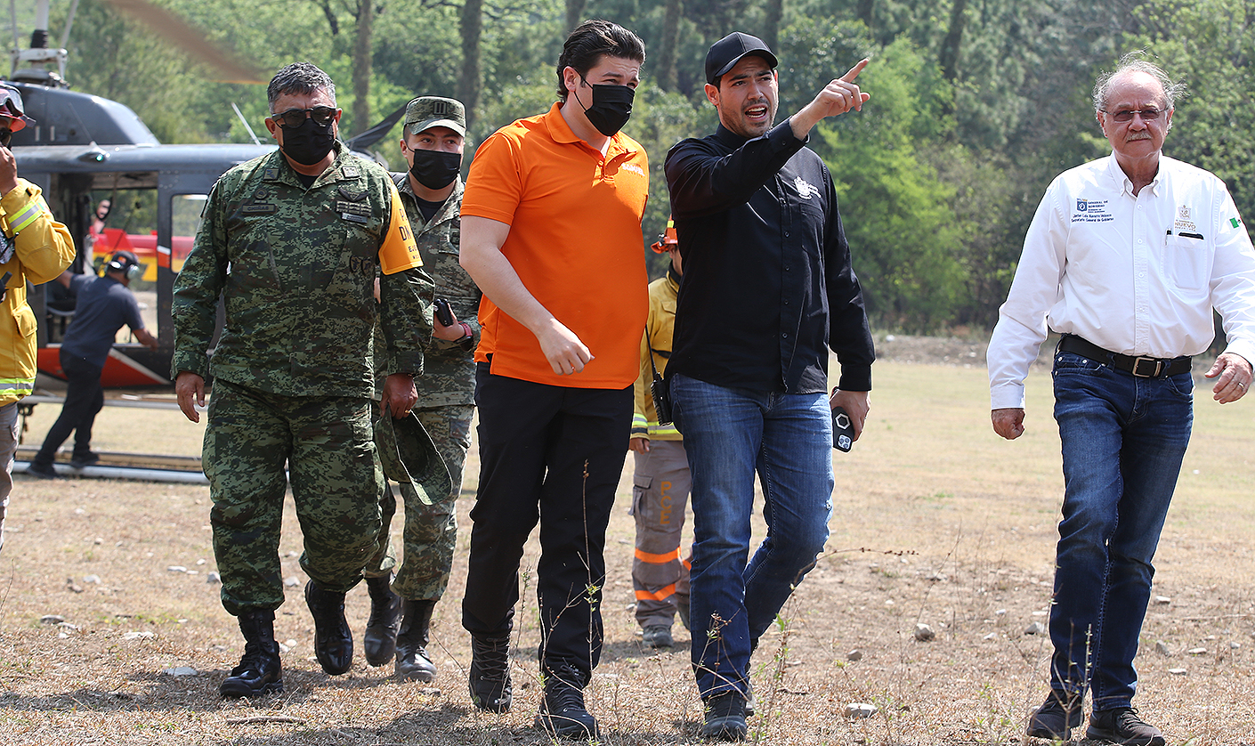 Acompañado del Secretario General de Gobierno, Javier Navarro; del Director de Protección Civil de Nuevo León, Erik Cavazos; y del alcalde de Santiago, David de la Peña, el Mandatario estatal recorrió en helicóptero las comunidades de Puerto Genovevo y Covadonga, que están siendo afectadas por las llamas.