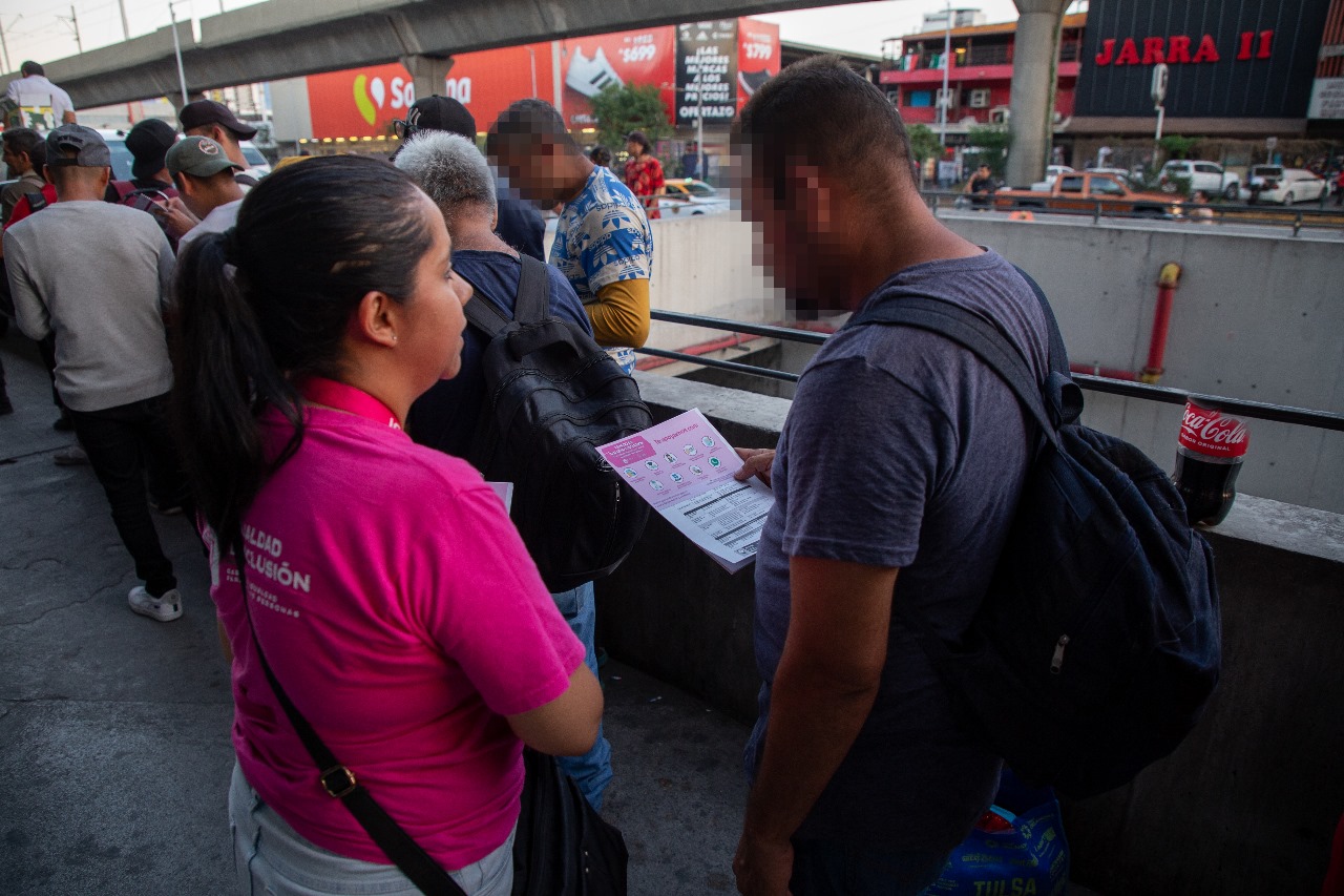 Coordinados por la Secretaría de Igualdad e Inclusión, dependencias como Salud, DIF Nuevo León y la Comisión Estatal de Derechos Humanos, con el apoyo de la Organización Internacional para las Migraciones (OIM), continuaron hoy con la jornada de atención para brindar consultas médicas, orientación migratoria, alimentos, kits de higiene personal, bebidas hidratantes y colchonetas, contando con intérprete de lengua de señas mexicana, a la población migrante que se encuentra en esta terminal, en su mayoría venezolanos.