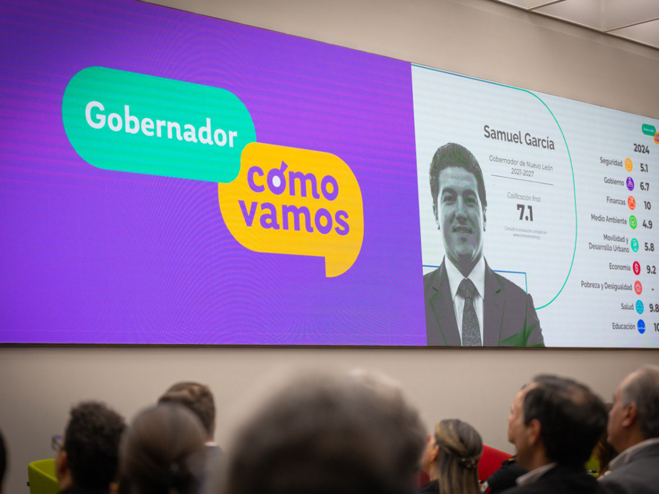 Monterrey, Nuevo León.- Al presentar su evaluación anual 2024, la plataforma ciudadana ‘Nuevo León, Cómo Vamos’ aprobó el trabajo del Gobernador de Nuevo León Samuel Alejandro García Sepúlveda.