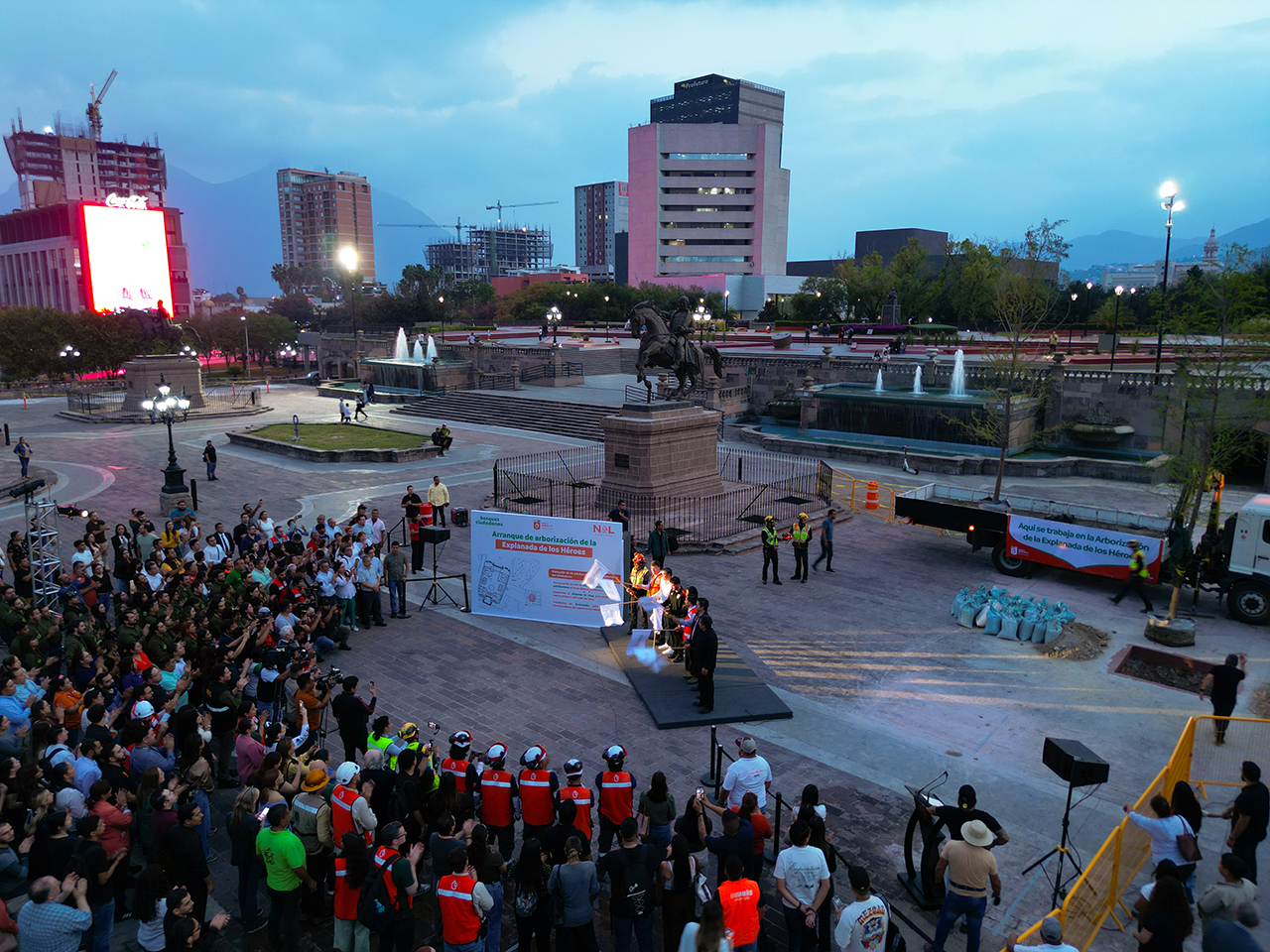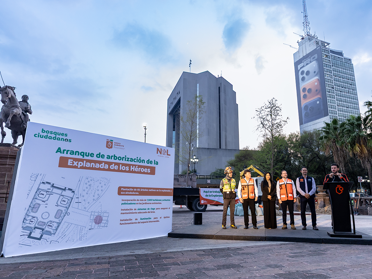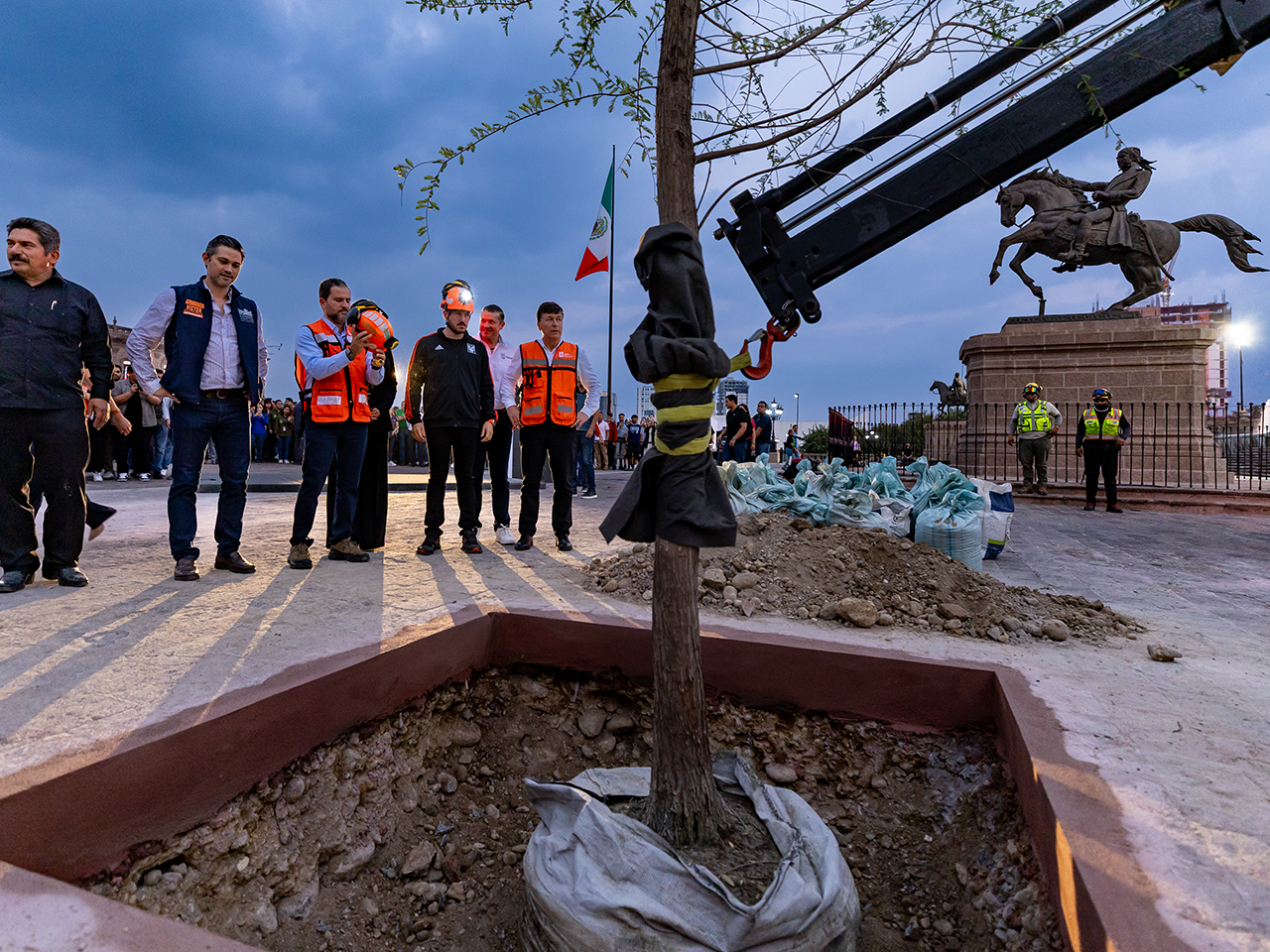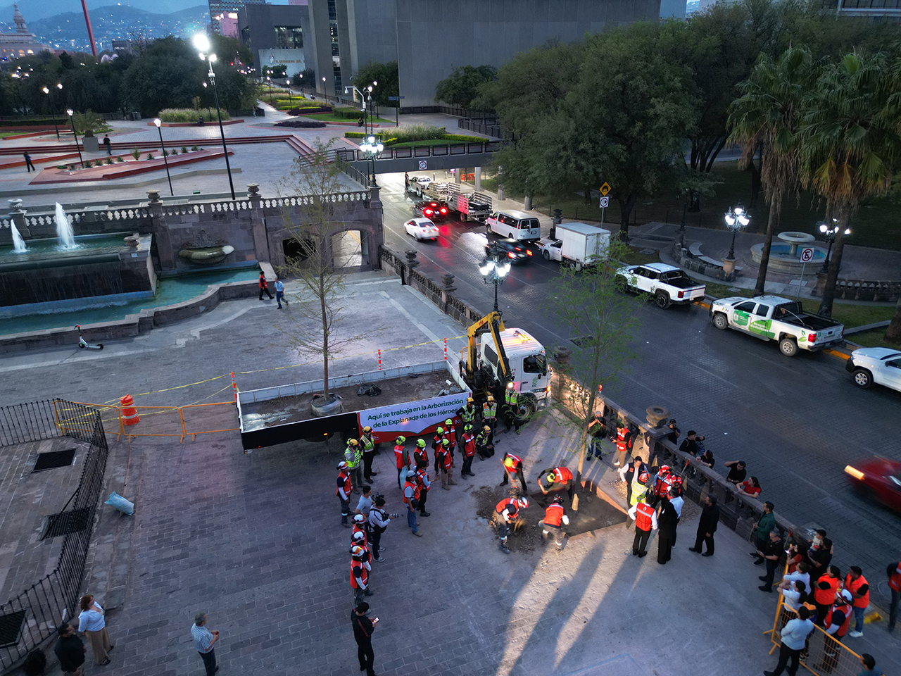Monterrey, Nuevo León.- Siguiendo con la estrategia y avanzado a la meta de plantar más de un millón de árboles en la ciudad, el Gobernador de Nuevo León, Samuel Alejandro García Sepúlveda dio arranque a lo que será una transformación histórica en la Explanada de los Niños Héroes, donde se plantarán 64 árboles nativos de la región.