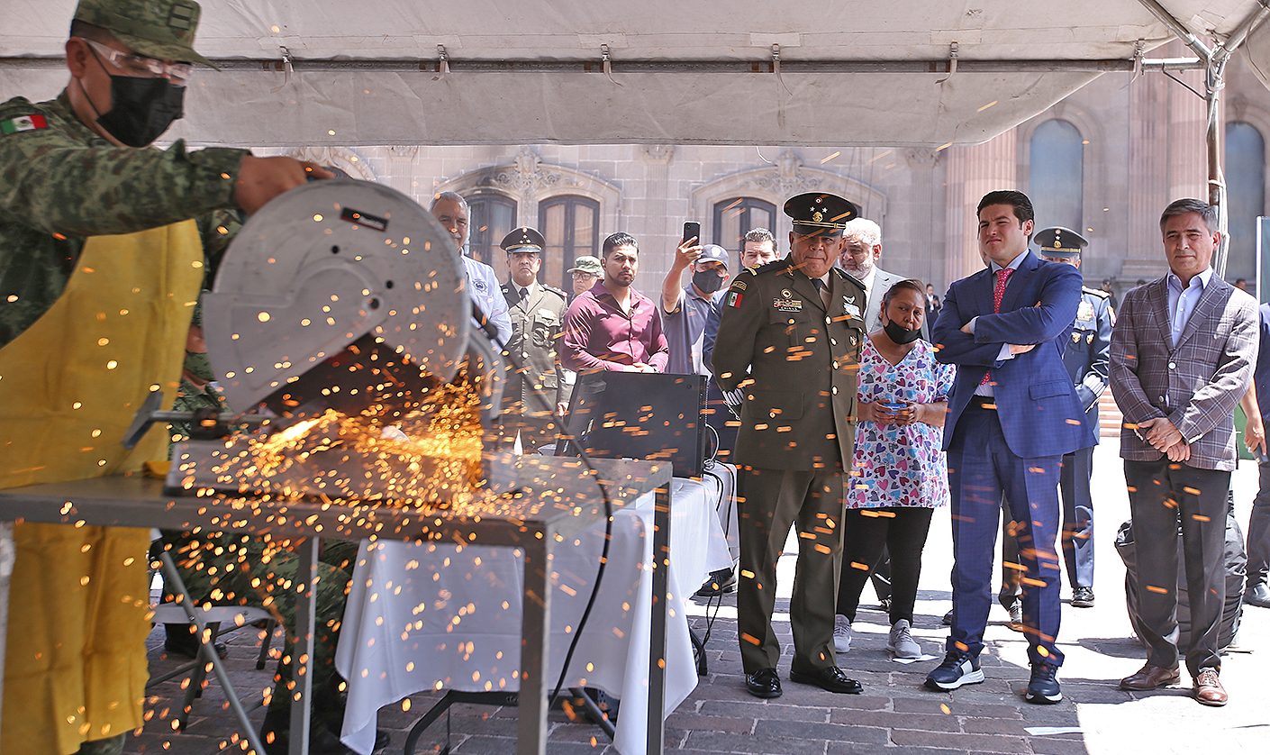Durante el evento efectuado en la Explanada de los Héroes, el Gobernador Samuel García supervisó el módulo donde constató la entrega de un arma larga, la cual fue destruida en ese momento.