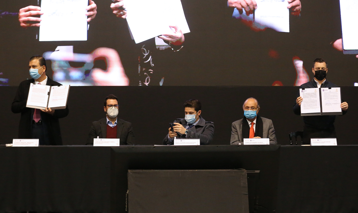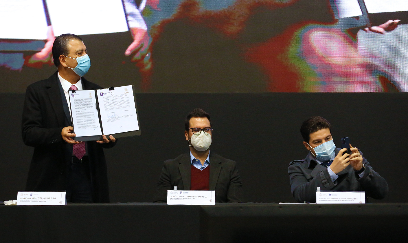 Para formalizar este evento que busca garantizar el derecho primordial a una vivienda digna, se signaron los Convenios de Regularización de Asentamientos Humanos, uno entre el Instituto Nacional del Suelo Sustentable y FOMERREY, así como el de colaboración entre Municipios y este organismo.