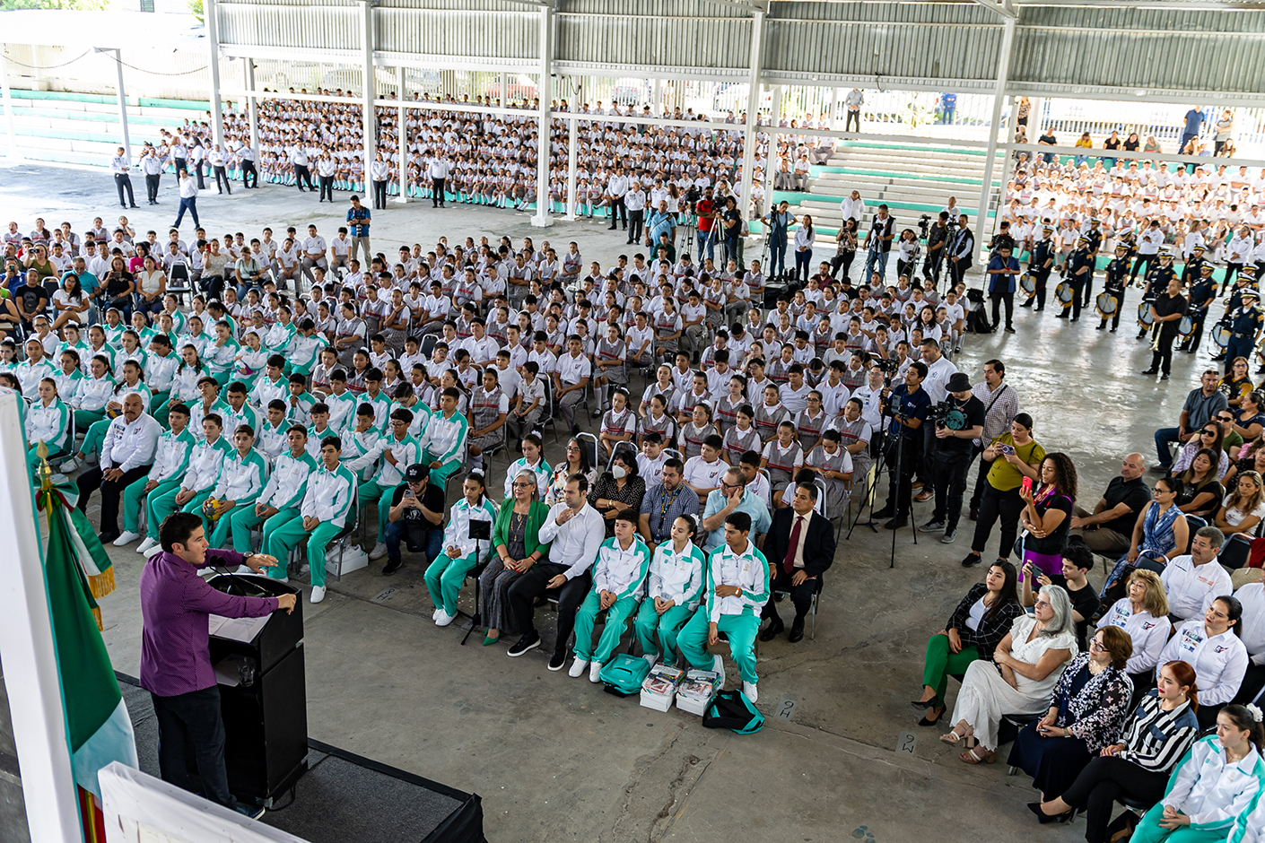 Asistieron a la ceremonia de Inicio de Clases Ciclo Escolar 2024-2025 Francisco Martínez Calderón, Secretario General de la Sección 21 del SNTE: Juan José Gutiérrez Reynosa, Secretario General de la Sección 50 del SNTE; Xóchitl Leticia Moreno Fernández, Directora General de Desarrollo Curricular, en representación de la Secretaría de Educación Pública (SEP), e Irene Villafuerte, Directora de la Escuela Secundaria 50 “José Vasconcelos”.