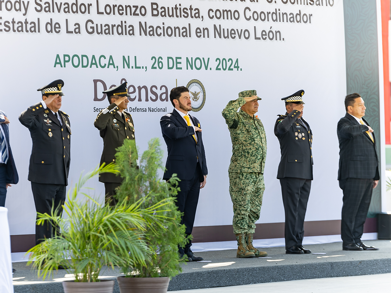 - Durante la ceremonia, el Gobernador fue testigo del cambio de mandos y los honores del Comisario en Jefe ante la protesta al frente de la zona que alberga a Nuevo León.